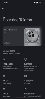 Le Phone (3a) Pro est livré avec Android 15 et NothingOS 3.1. L'appareil a reçu plusieurs mises à jour pendant la période de test - au moment du test, le dernier correctif de sécurité datait de février 2025. Selon le fabricant, le Phone (3a) Pro sera fourni avec des mises à jour logicielles pendant 3 ans et des mises à jour de sécurité pendant 6 ans.