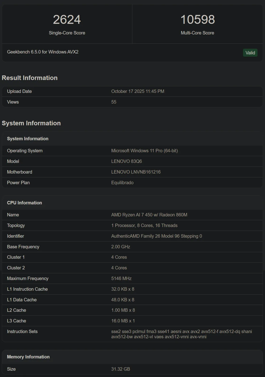 Malheureusement, la Ryzen AI 7 450 ne fait pas mieux https://browser.geekbench.com/v6/cpu/14514015le Ryzen AI 7 450 ne fait pas mieux, avec des scores de 2 624 pour un seul cœur et de 10 598 pour plusieurs cœurs. En revanche, le Ryzen AI 7 350 il est apparu aux côtés du même ordinateur portable Lenovo mentionné ci-dessus avec 32 Go de mémoire système. Du point de vue des spécifications, il conserve le schéma 4+4, avec le cluster Zen 5 atteignant 5,14 GHz.
