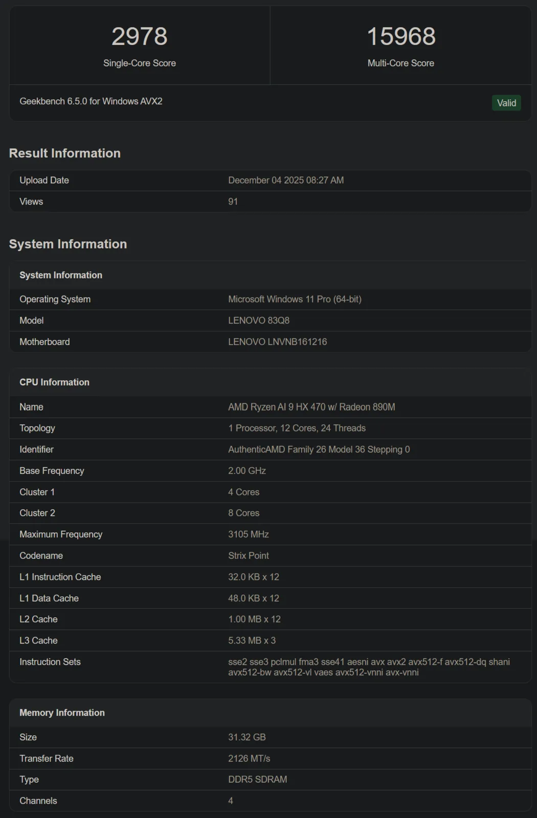 En commençant par le fleuron Ryzen AI 9 HX 470, il obtient des scores de 2 978 et 15 968 dans les tests mono et multicœurs de Geekbench de Geekbench. C'est plus ou moins la même chose que le Ryzen AI 9 HX 370 (2 890/15 051), mais cela n'est pas représentatif des performances du processeur Gorgon Point, car il n'atteint pas systématiquement sa vitesse maximale (5,3 GHz). Il a été testé avec un ordinateur portable Lenovo inédit doté de 32 Go de RAM DDR5-2126, ce qui a probablement une incidence sur les résultats globaux de Geekbench.