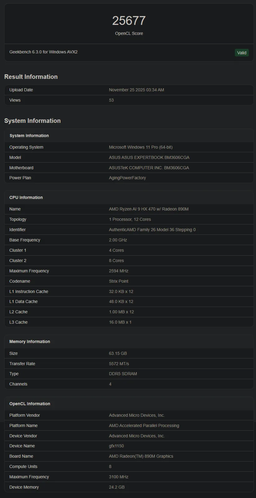 Nous avons également un aperçu de la puissance de la Ryzen AI 9 HX 470 Radeon 890M iGPU de la Ryzen AI 9 HX 470. Elle obtient un score de 25 677 dans le benchmark OpenCL de Geekbench ( ). Une fois de plus, il ne parvient pas à surpasser le même GPU sur son homologue Strix Point (39 622) malgré un boost clock légèrement plus élevé (3,1 GHz contre 2,9 GHz). Cette Radeon 890M a été testée sur un ordinateur portable Asus avec 64 Go de mémoire DDR5-5572.