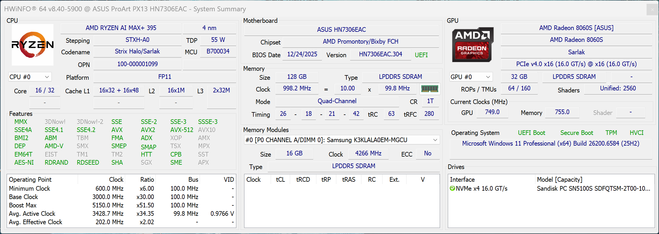 | Asus ProArt PX13 HN7306EA AMD Ryzen AI Max+ 395 ⎘ AMD Radeon 8060S ⎘ 128 Go Mémoire, 2048 Go SSD | Amazon: 1. 200W Rectangle Conn Compatib... 2. ROG 200W Charger for Asus Pr... 3. ASUS 2025 ProArt PX13 (Repla... Prix de liste: 3900€ | 1.4 kg | 17.7 mm | 13.30" 2880x1800 255 PPI OLED | |