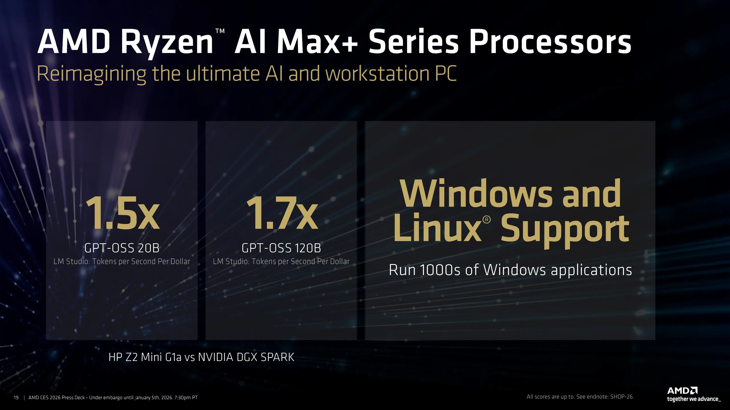 Sur le plan des performances, AMD affirme que Ryzen AI Max+ offre 1,5 et 1,7 fois plus de jetons par seconde par dollar dans LM Studio en utilisant le modèle GPT-OSS 20B et GPT-OSS 120B, respectivement, avec un HP Z2 Mini G1a à 2 500 $ équipé de Ryzen AI Max+ 395 par rapport à un Nvidia DGX Spark à 4 000 $, tous deux avec une mémoire unifiée de 128 Go.
