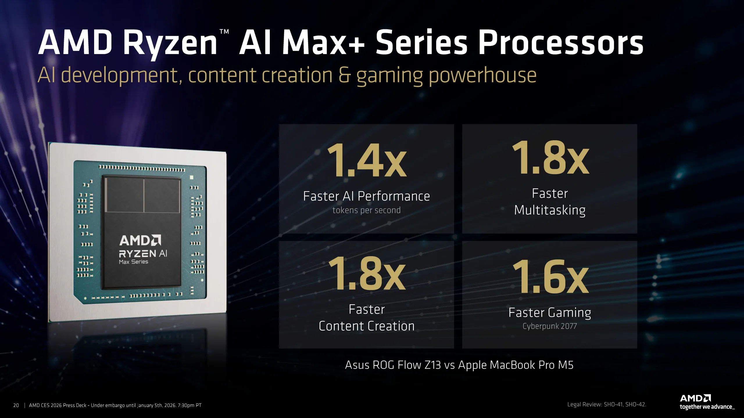 AMD a également annoncé des performances d'IA 1,4 fois plus rapides, un multitâche et une création de contenu 1,8 fois plus rapides, et des jeux 1,6 fois plus rapides avec un Asus ROG Flow Z13 équipé de la Ryzen AI Max+ 395 fonctionnant à 55 W (profil silencieux) par rapport à un Apple MacBook Pro 14 équipé d'une puce M5 à 10 cœurs (profil équilibré) et 24 Go de RAM.