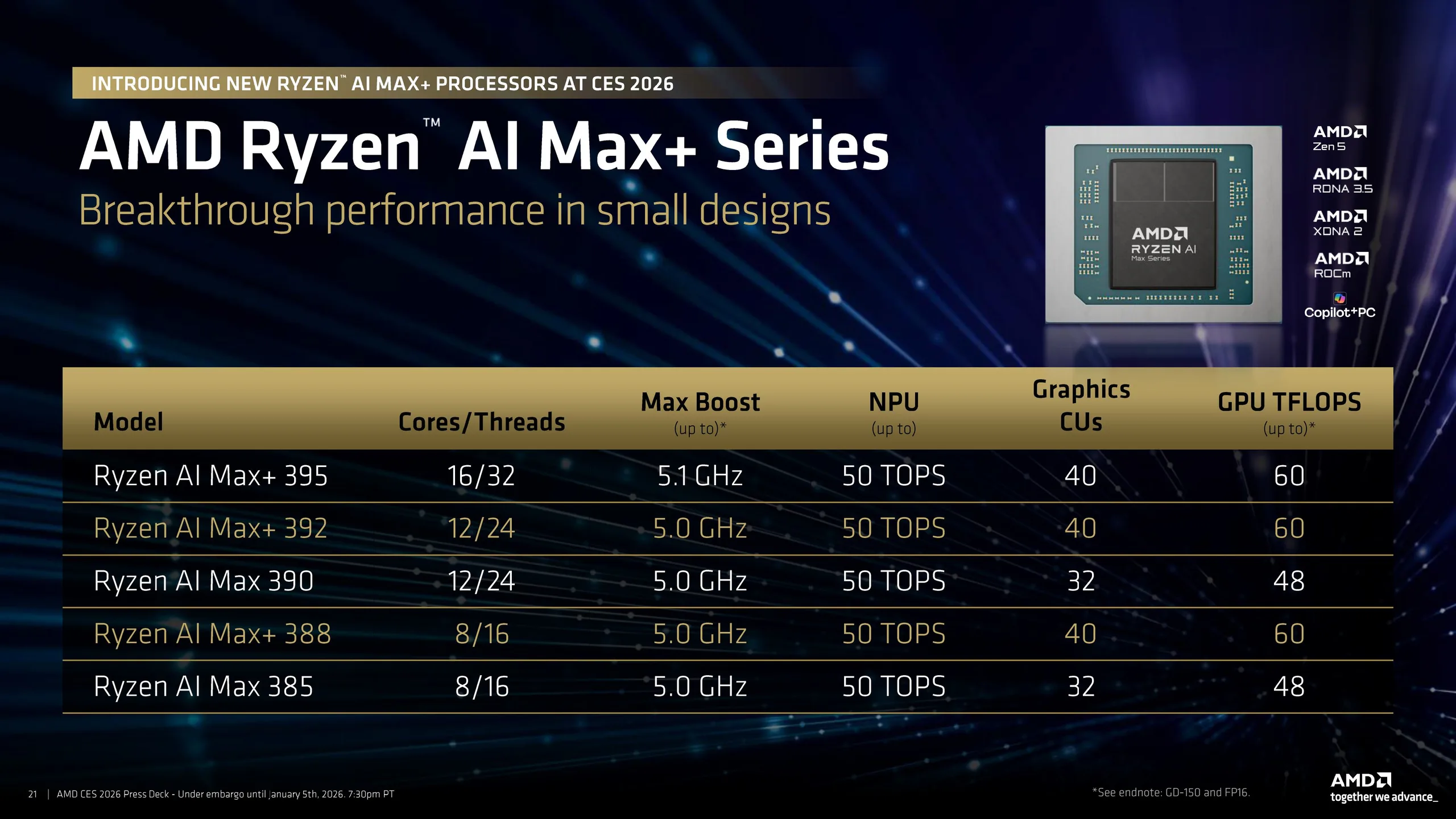 Au CES 2026, AMD présentera deux nouveaux modèles dans la gamme Ryzen AI Max+ - le Ryzen AI Max+ 392 et le Ryzen AI Max+ 388 destinés aux développeurs d'intelligence artificielle.