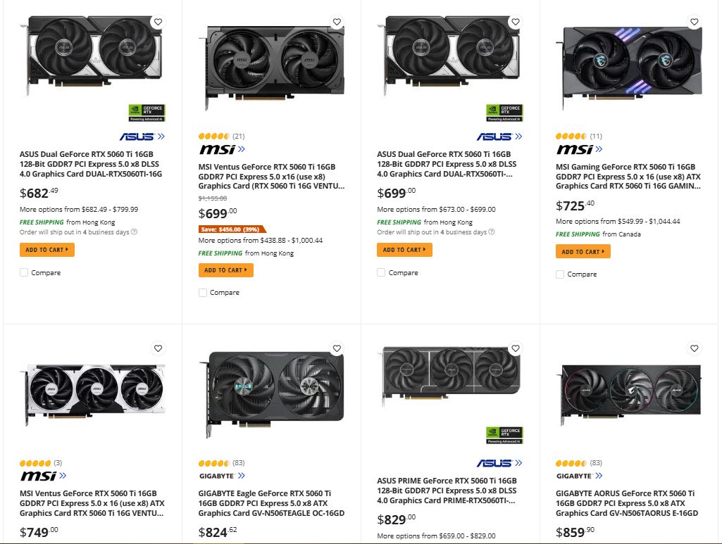 Par exemple, la plupart des RTX 5070 Ti AIB sur Newegg se vendent actuellement à un prix bien plus élevé que le prix de vente conseillé de 749$. Il en va de même pour la RTX 5060 Ti 16 Go. Heureusement, la RX 9070 et RX 9070 XT sont encore vendus à des prix raisonnables.