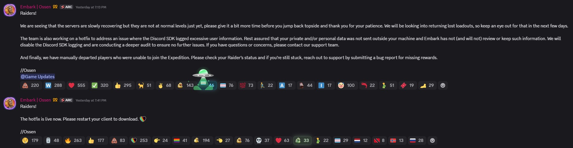 Peu après que le problème ait été rendu public, Embark Studios a réagi et confirmé que le Discord SDK avait enregistré plus d'informations utilisateur que prévu. Le studio a assuré aux joueurs que les données n'ont jamais été transmises en dehors de l'ordinateur de l'utilisateur et que les développeurs n'ont jamais accédé aux messages ni ne les ont stockés eux-mêmes. Un correctif a également été publié pour désactiver le comportement d'enregistrement problématique. L'équipe a également déclaré qu'elle procédait à un audit plus approfondi afin de s'assurer que des problèmes similaires ne se reproduisent pas à l'avenir.