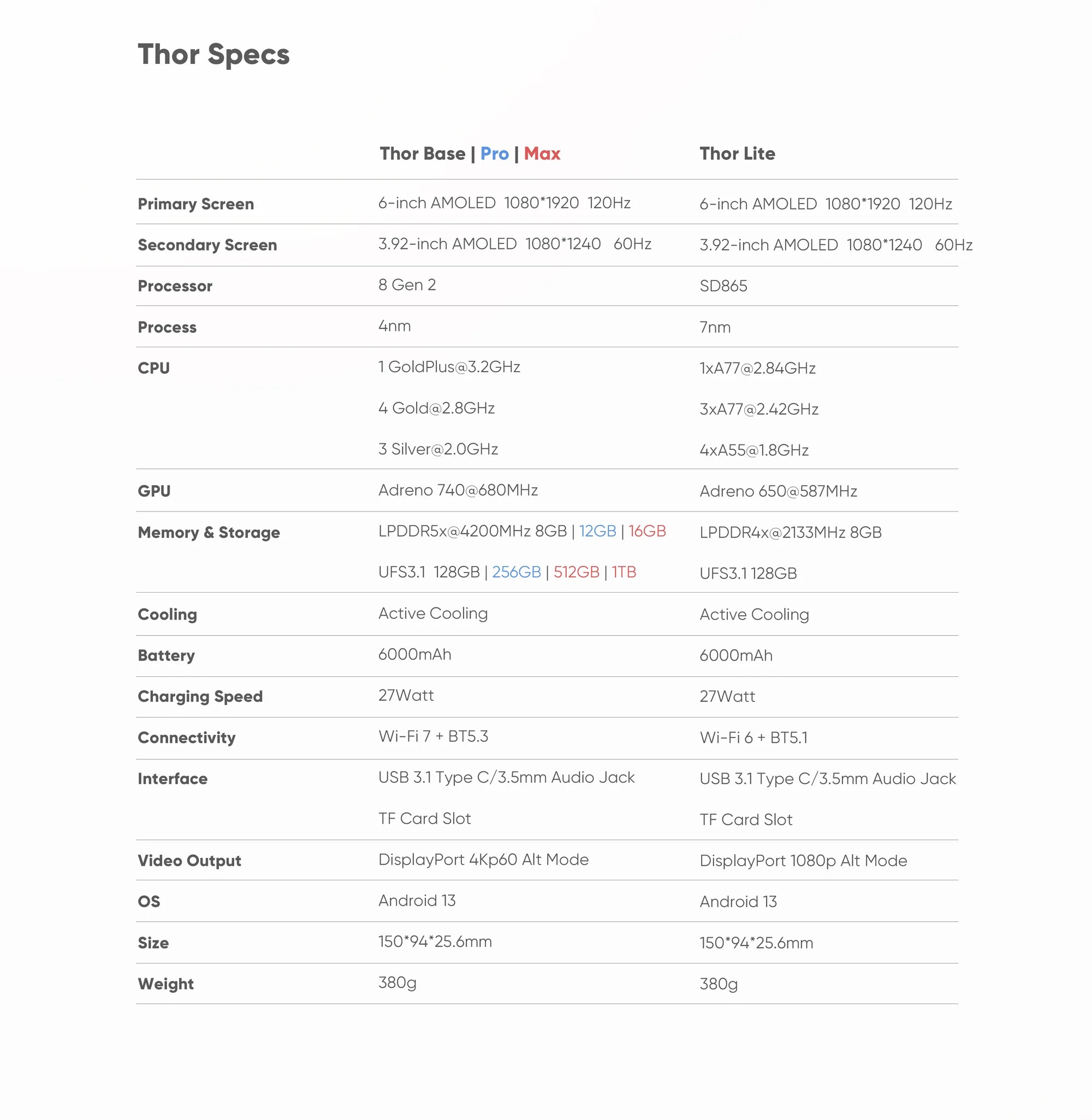 Le changement de type de stockage affecte le Snapdragon 8 Gen 2-du Thor. Il s'agit du Thor Base avec 8 Go de RAM et 128 Go de stockage, du Thor Pro avec 12 Go de RAM et 256 Go de stockage, et du Thor Max avec 16 Go de RAM et 512 Go de stockage. Le Thor Lite, équipé d'un Snapdragon 865 utilise déjà le stockage UFS 3.1 et continuera à le faire.