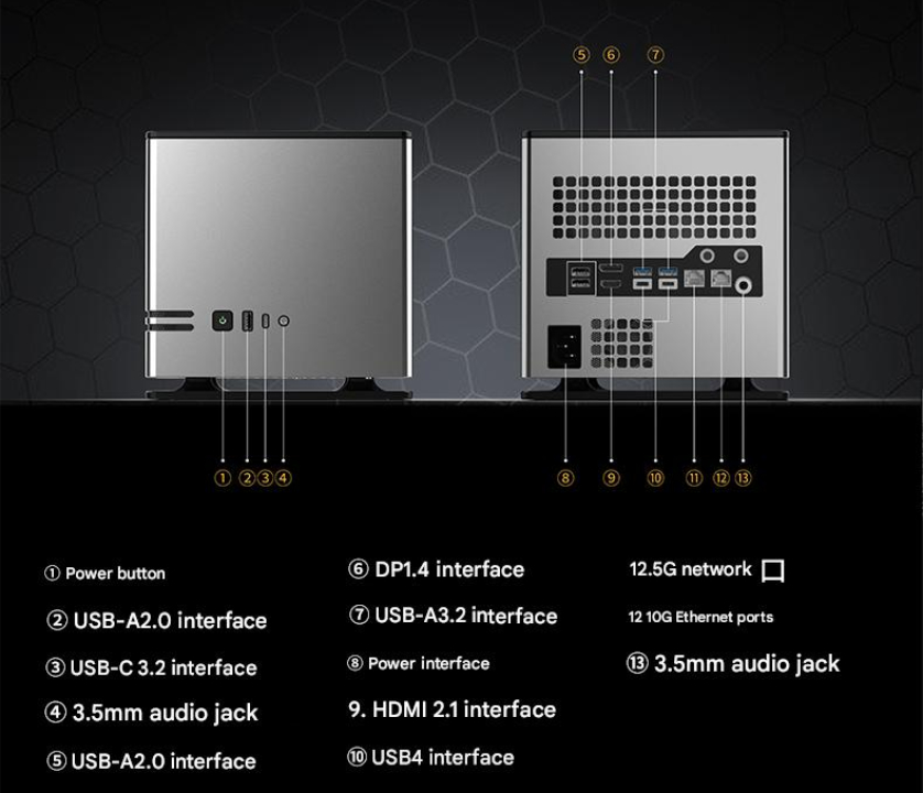 Comme le montre l'image ci-dessous, l'Abee AI Station comporte de nombreux ports sur ses panneaux avant et arrière. En outre, le mini-PC contient un bloc d'alimentation de 400 W intégré. Néanmoins, Abee affirme que l'AI Station ne mesure que 199 x 199 x 199 mm. Cependant, la coque entièrement en aluminium contribue au poids officiel de 5,3 kg de l'appareil.