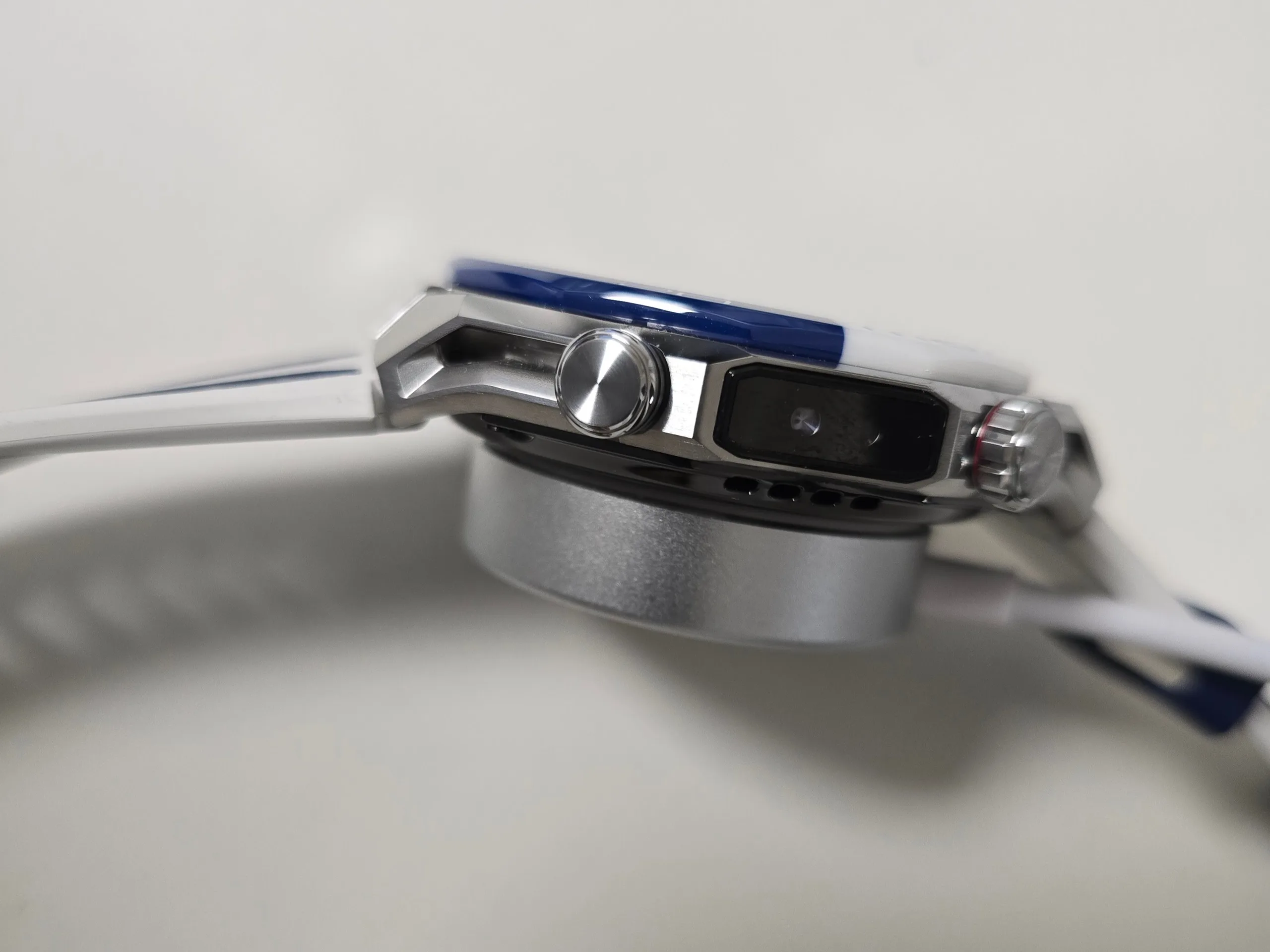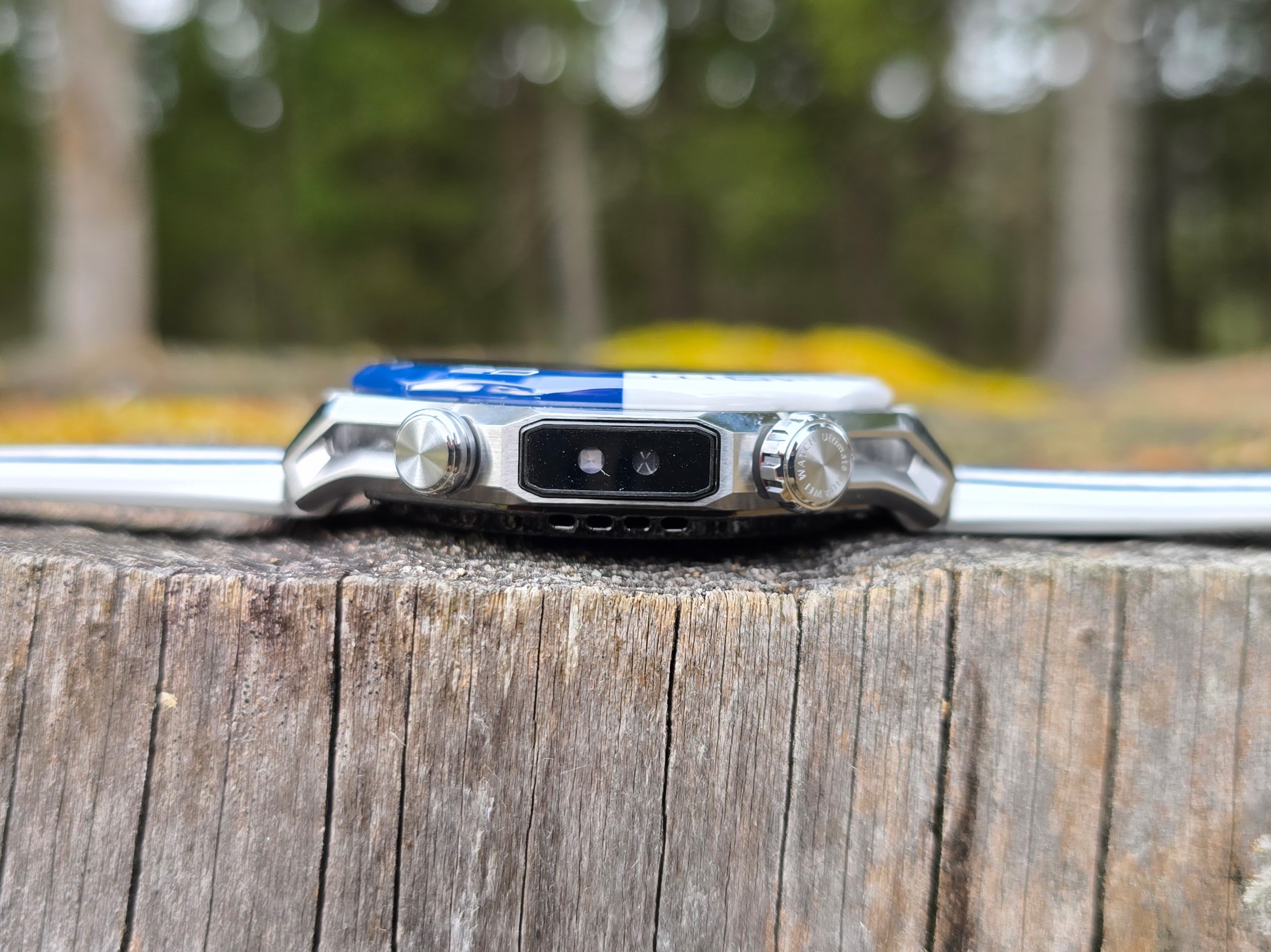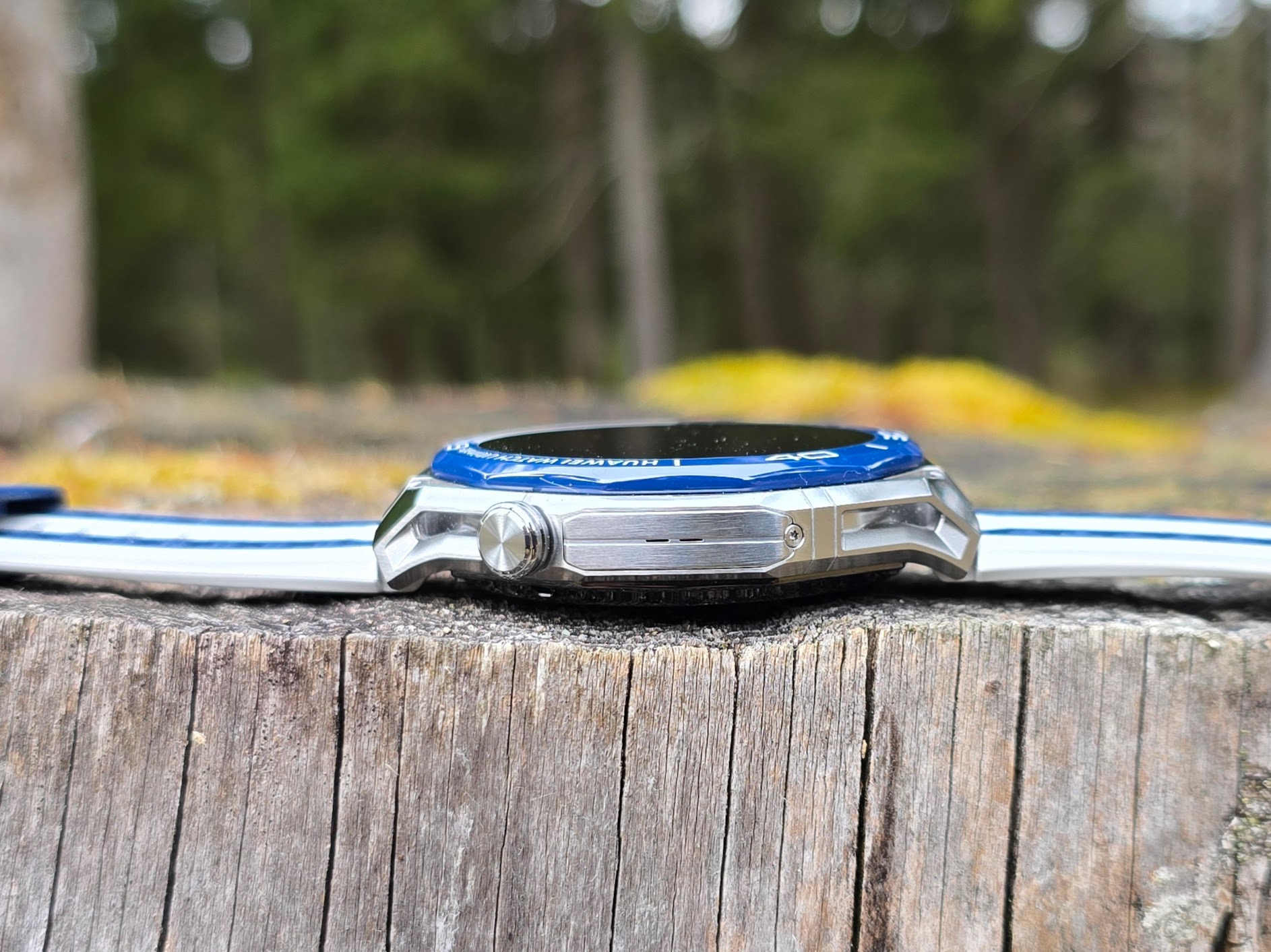 Sur le côté droit, vous trouverez une couronne rotative et pressable, un bouton, un haut-parleur et le capteur X-Tap de Huawei. Le côté gauche abrite un autre bouton et un capteur de profondeur. Le bracelet de 22 millimètres peut être remplacé sans outil.
