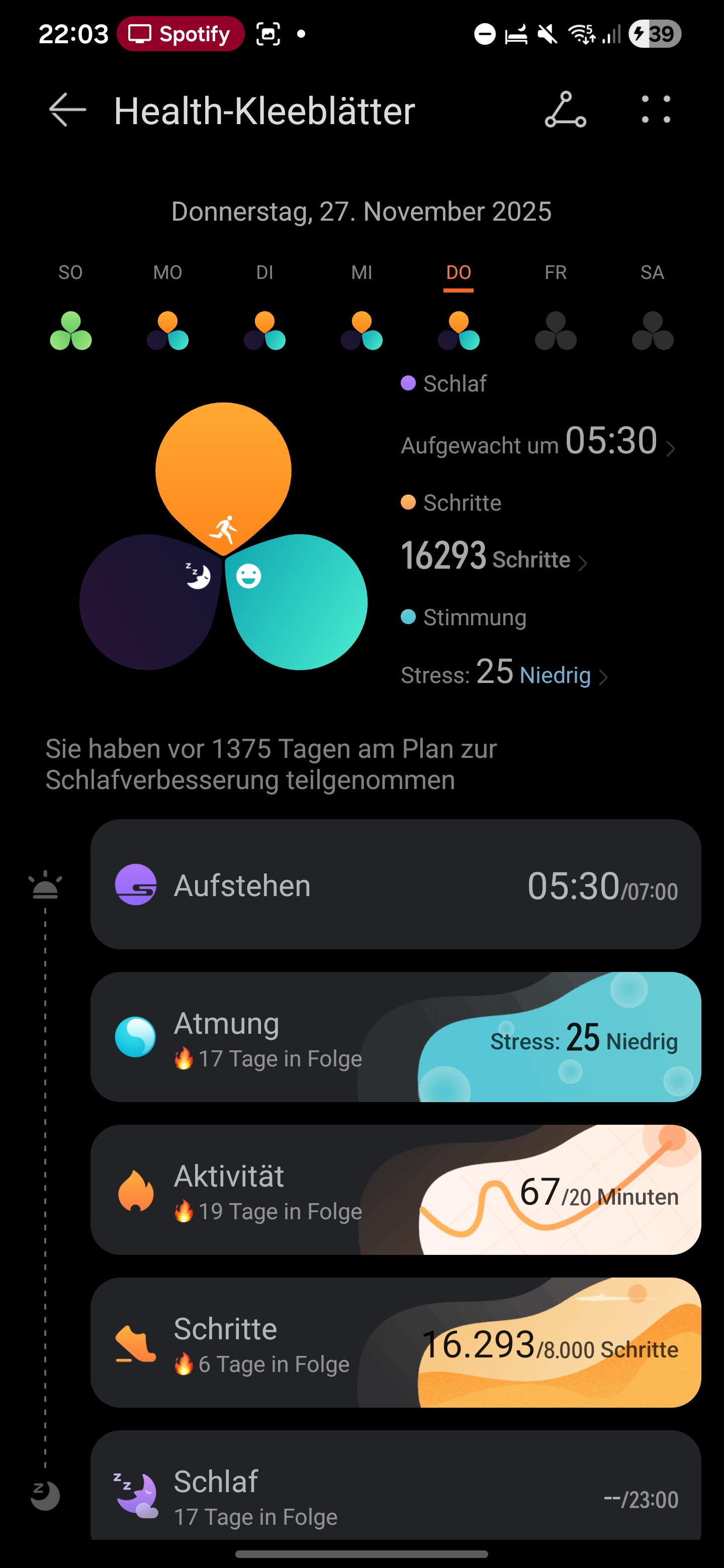 Huawei propose plusieurs formats visuels pour les cibles d'activité. Outre les anneaux habituels, il existe également une disposition en forme de trèfle. Ses feuilles se remplissent au cours de la journée, la smartwatch suivant les habitudes quotidiennes et fixant des objectifs tels que se réveiller dans un créneau horaire spécifique ou rester actif tout au long de la journée.