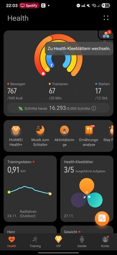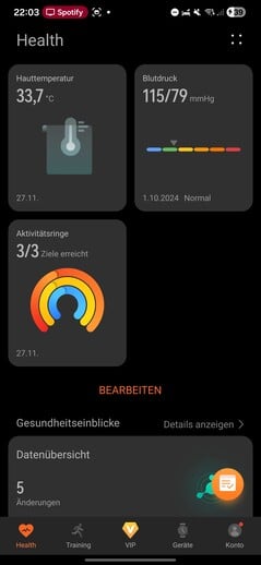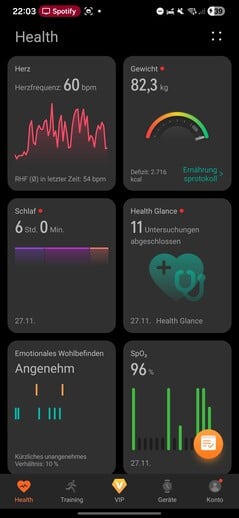 L'application Santé est divisée en cinq sections : Santé, Entraînement, VIP, Appareils et Compte. L'onglet Santé sert de tableau de bord pour toutes les données biométriques enregistrées, affichées sous forme de tuiles personnalisables.