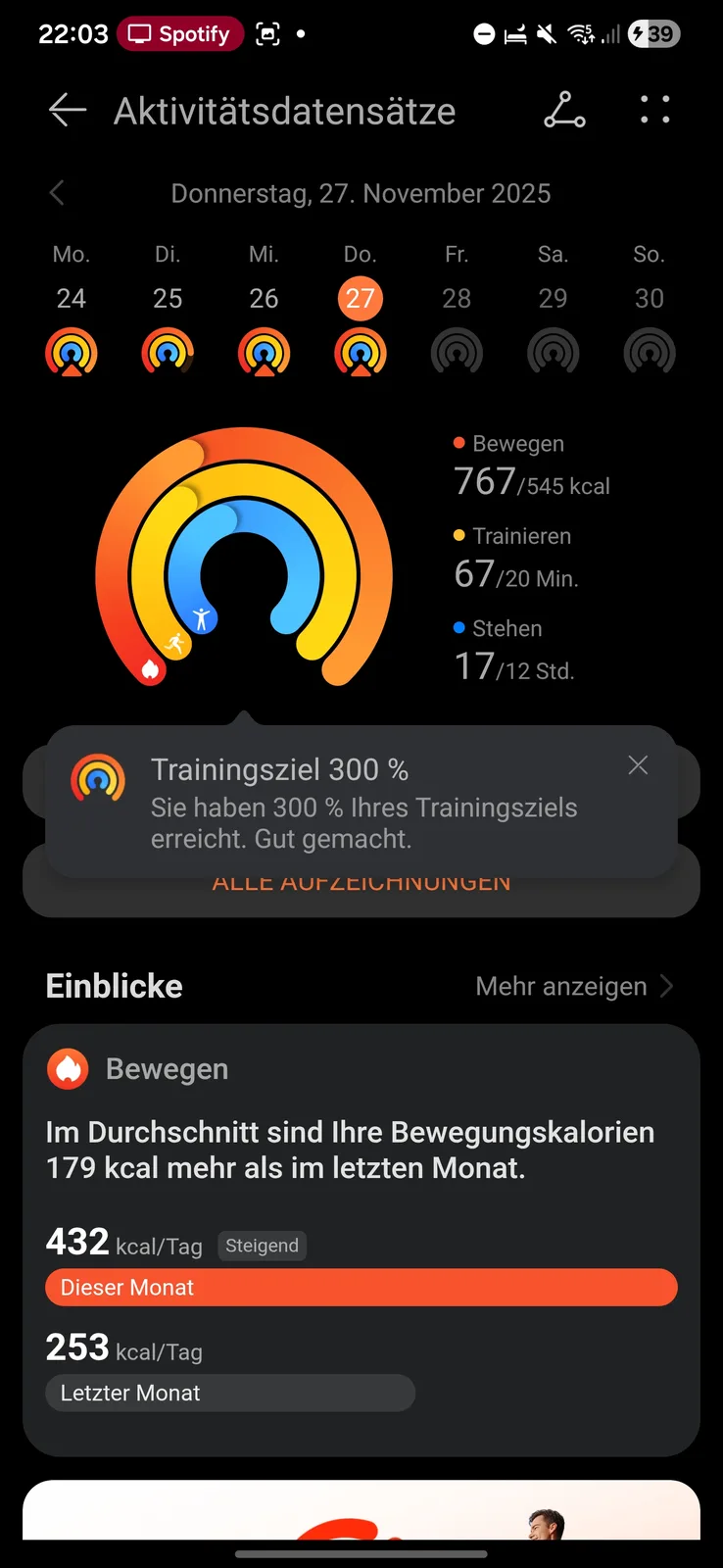 Nos résultats correspondent aux affirmations de Huawei. Sans eSIM, nous avons obtenu cinq jours d'utilisation avec l'AoD désactivé et quatre jours avec l'AoD activé. Lorsque la montre est utilisée sans smartphone couplé et qu'elle est portée de manière intensive lors d'activités sportives, l'autonomie de la batterie diminue en conséquence.