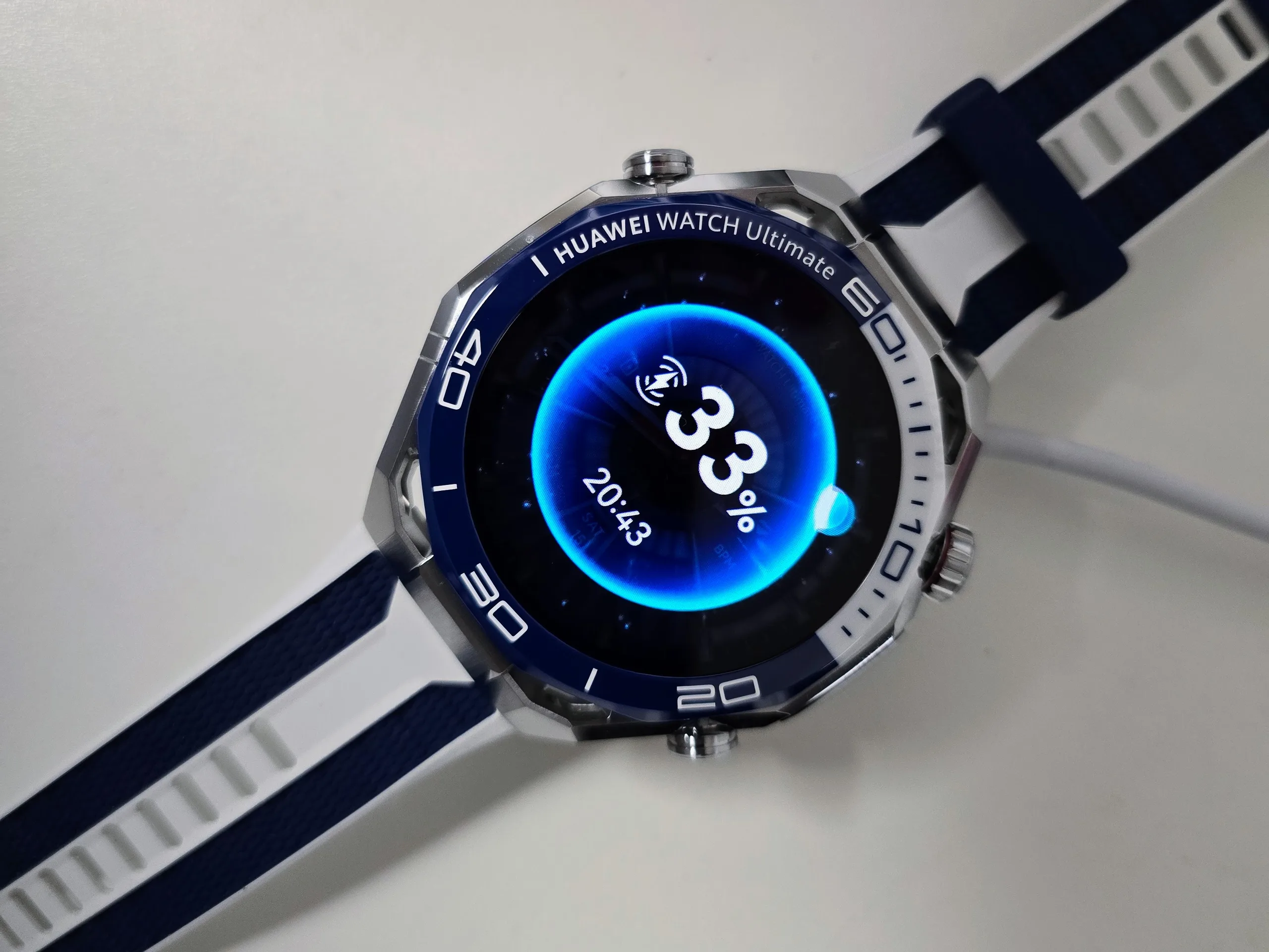 Huawei inclut une batterie de 867 mAh. La recharge se fait sans fil via un pad Qi. En utilisant un bloc d'alimentation Anker 355, la Watch Ultimate 2 est passée de 3 à 50 % en 40 minutes, et une charge complète a nécessité environ 90 minutes.