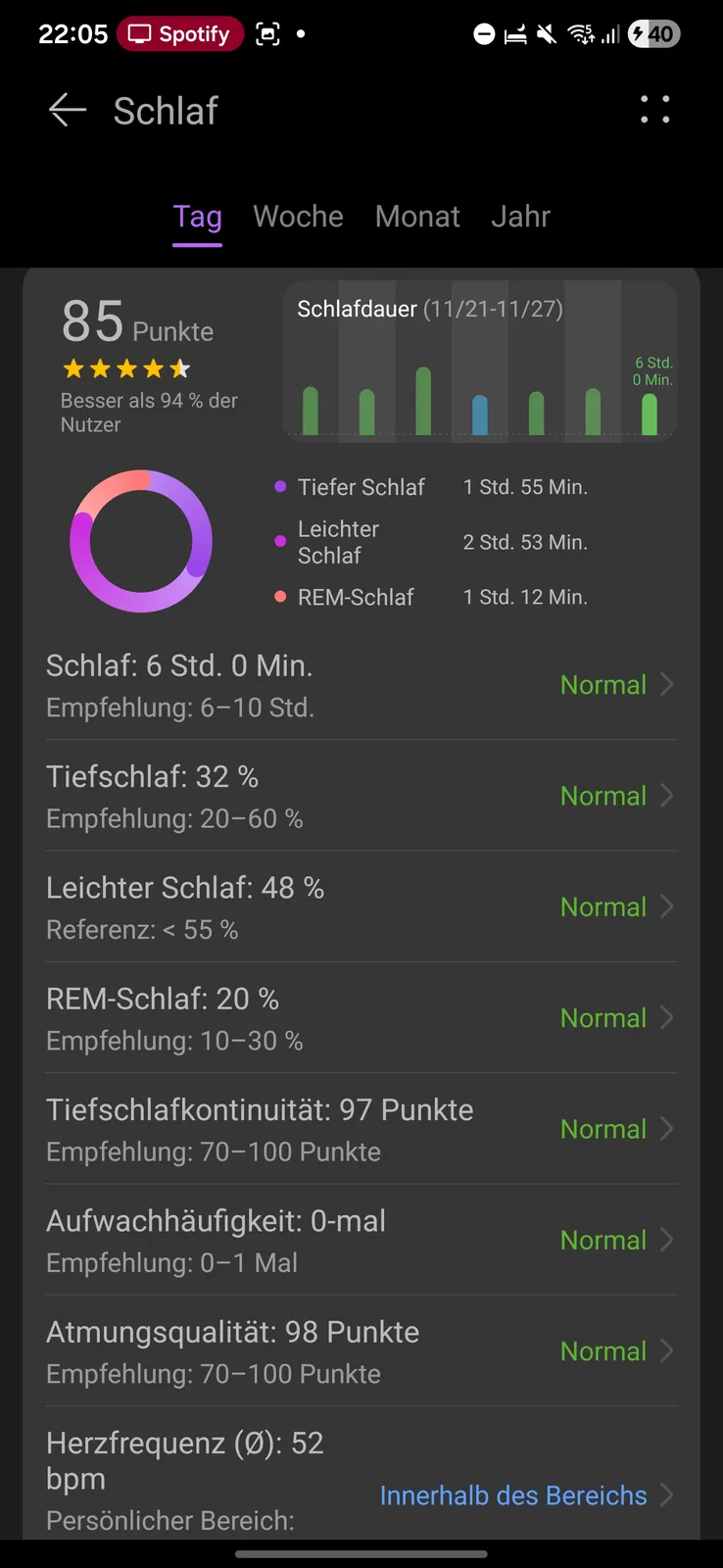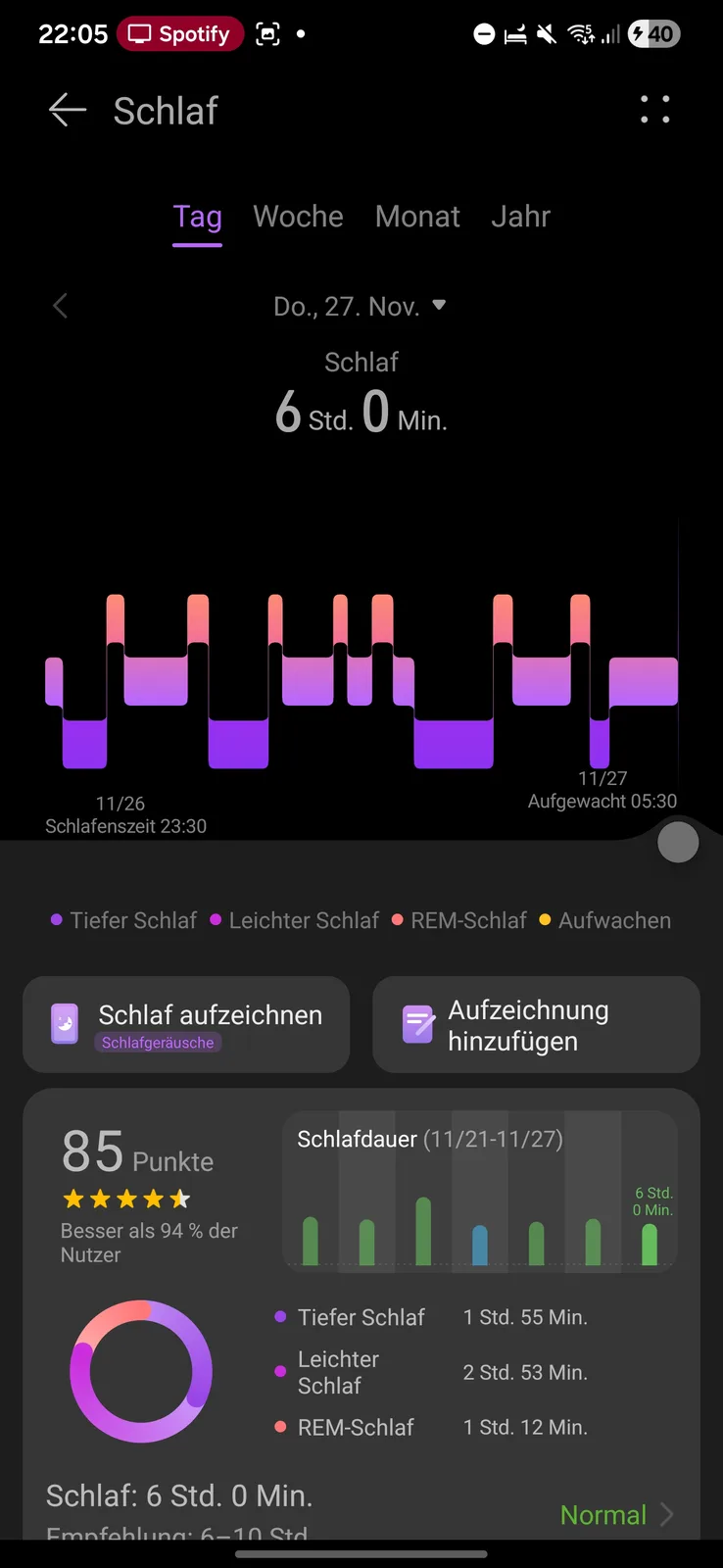 La Huawei Watch Ultimate 2 offre un suivi complet du sommeil. Elle enregistre les différents stades du sommeil et indique à la fois leur durée et leur proportion par rapport à la durée totale du sommeil. Ces stades sont visualisés sur une ligne de temps.