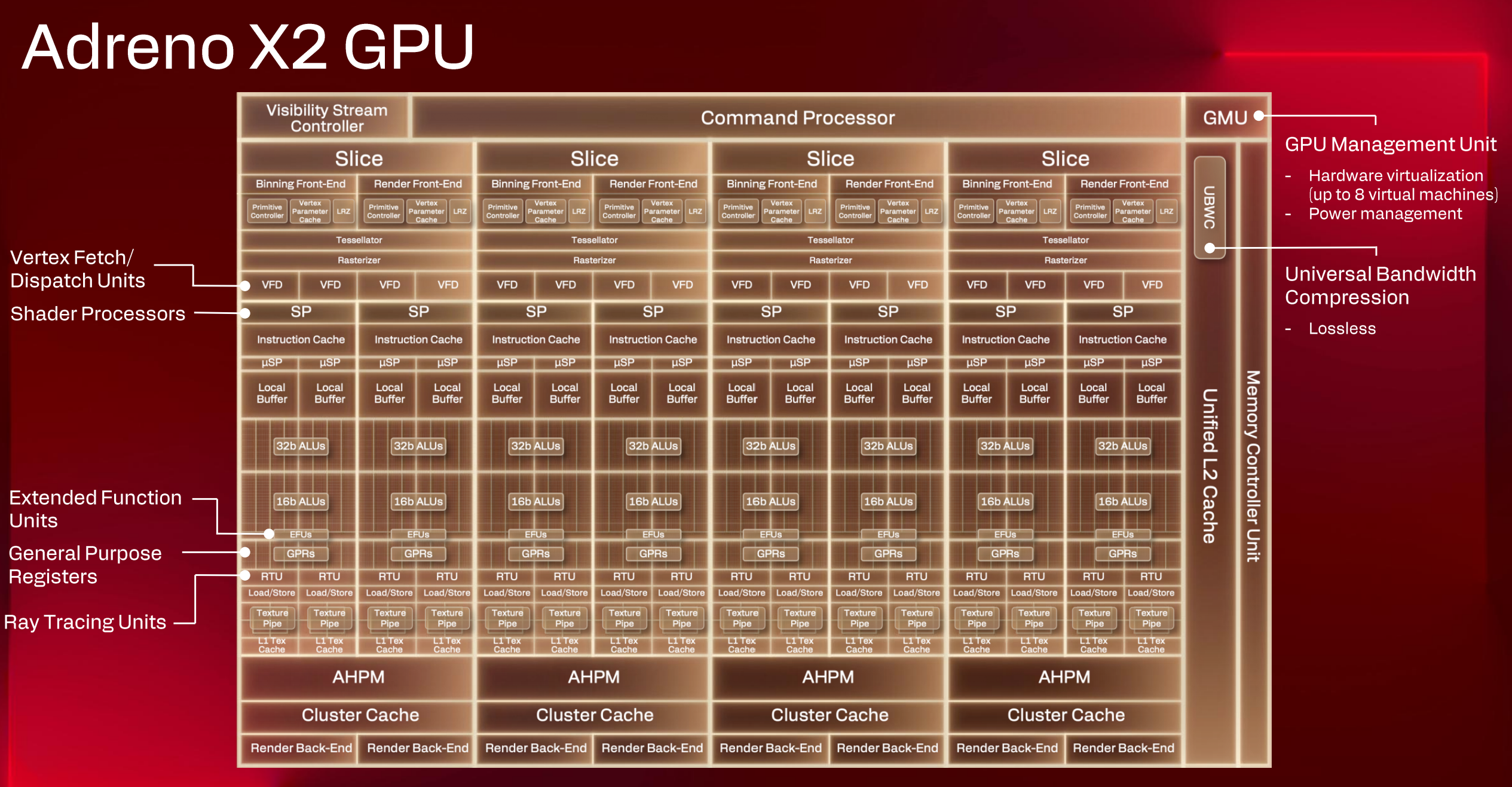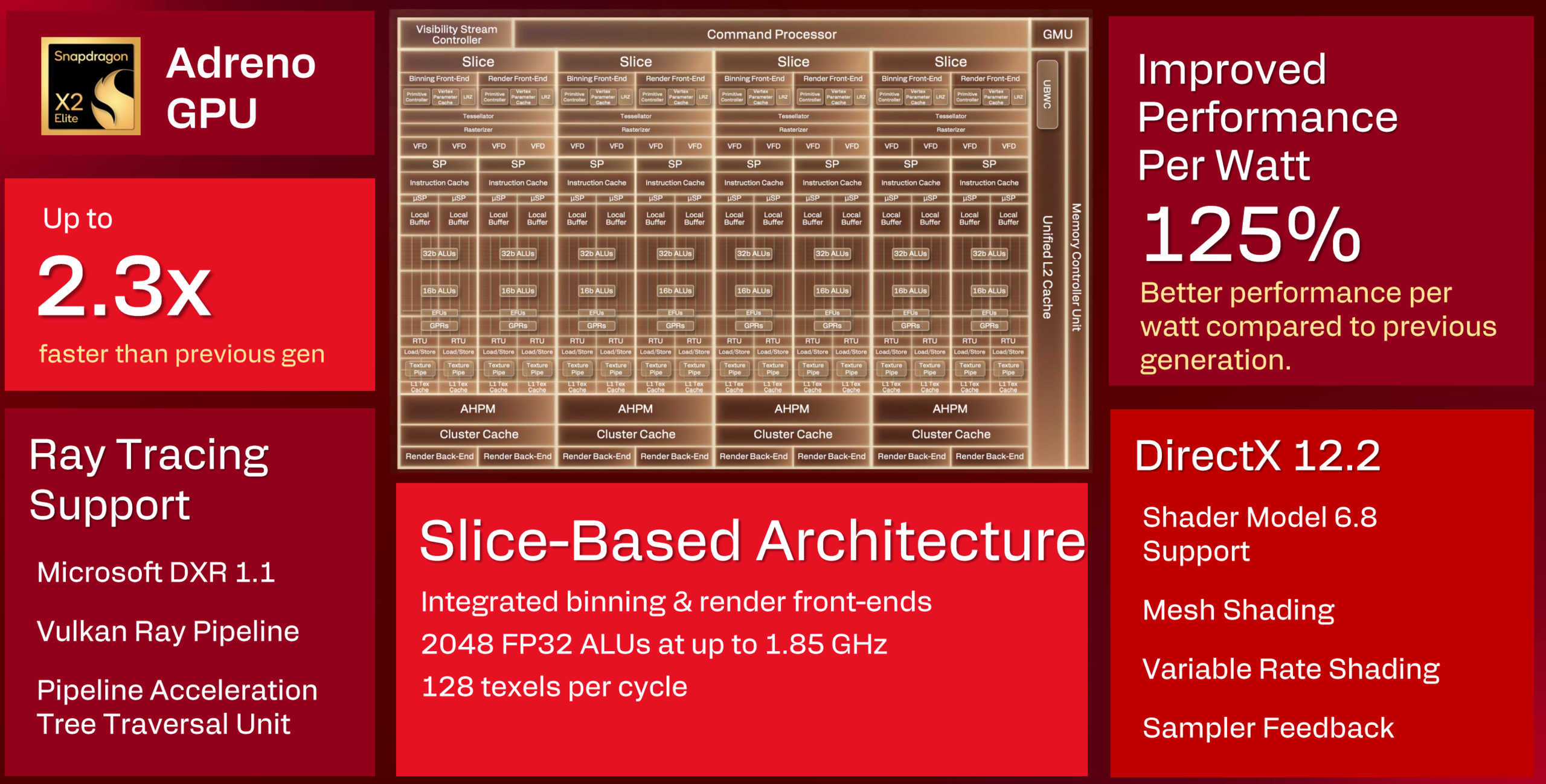 L'Adreno X2 y parvient grâce à 21 Mo de ce que Qualcomm appelle la "mémoire sur puce haute performance". Il s'agit essentiellement d'un bloc de cache L3 accessible par toutes les tranches de rendu (5,25 Mo/tranche). Qualcomm affirme que les processeurs de shaders peuvent y accéder à une vitesse allant jusqu'à 4 TB/s. Par ailleurs, le GPU peut accéder à la mémoire vive LPDDR5X-9523 du SoC à une vitesse pouvant atteindre 228 Go/s. Chaque tranche de l'Adreno X2 dispose de deux pipelines de texture, de quatre unités de raytracing, de deux backends de rendu et de deux processeurs de shaders.
