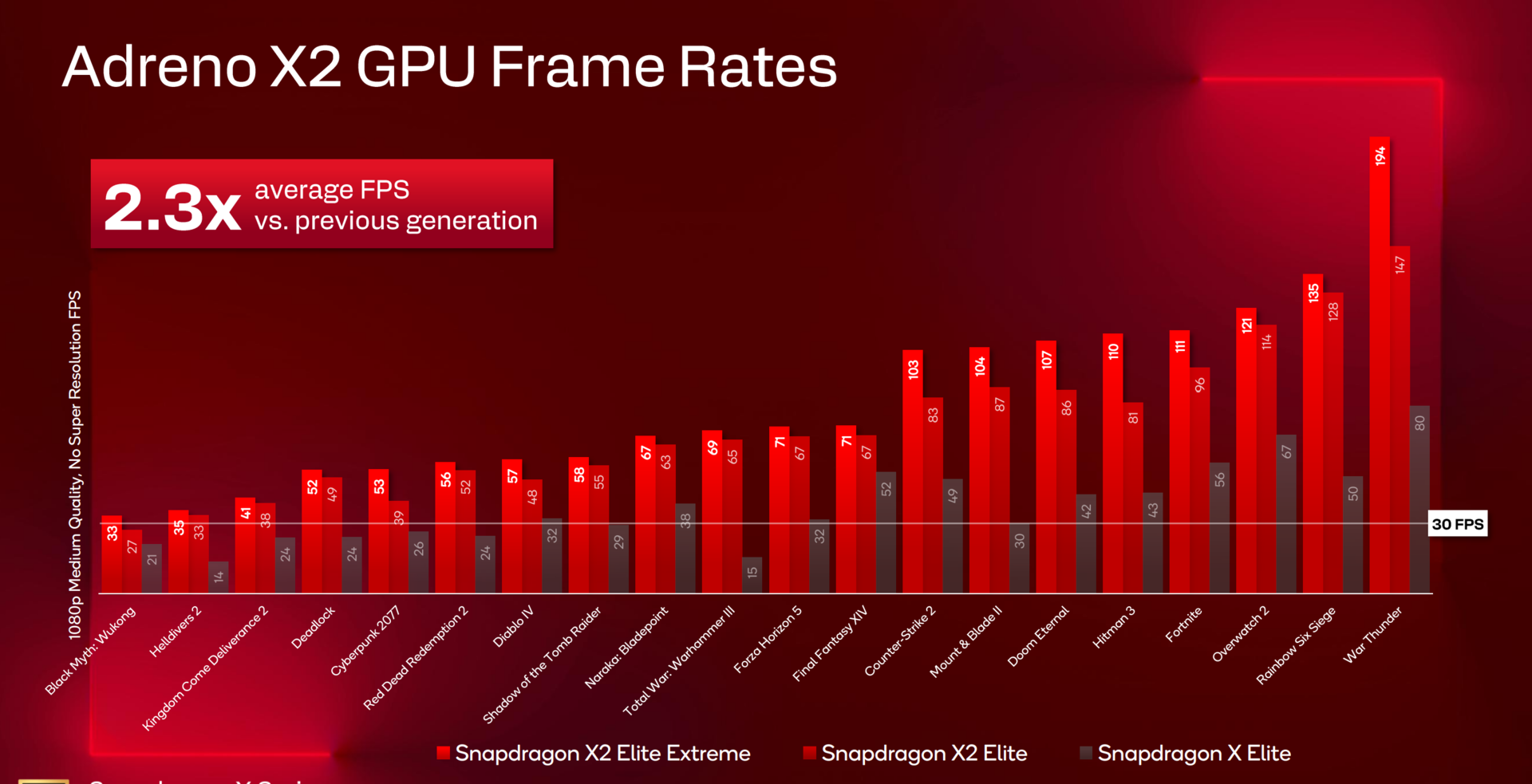Si l'on compare l'Adreno X2 à des solutions similaires d'Intel et d'AMD, on constate qu'il est étonnamment puissant. Il fait jeu égal avec la Radeon 890M et l Arc 140v dans un large éventail de titres, tels que Diablo IV, Metro Exodus, The Witcher 3: Wild Hunt et, une fois encore, War Thunder. Il s'agit de tests de référence effectués sur un appareil de référence Qualcomm et non sur un ordinateur portable prêt pour la production. Les différences réelles seront visibles lorsque les ordinateurs portables équipés de Snapdragon X2 Elite apparaîtront au début de l'année 2026.