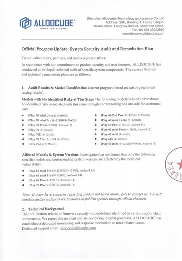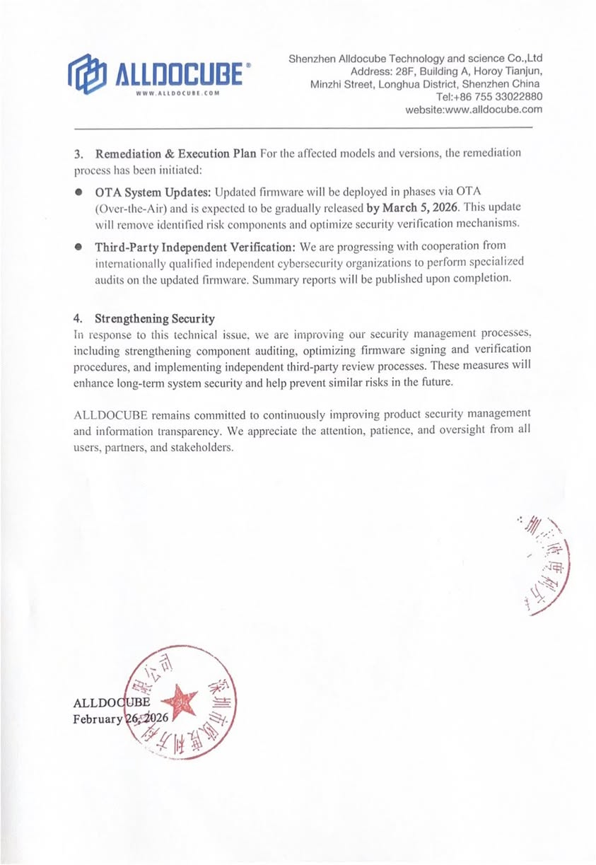 Les appareils qui ne sont pas en danger immédiat, selon les enquêtes d'Alldocube, peuvent être trouvés dans les documents ci-dessus. Alldocube a promis des mises à jour de firmware OTA d'ici le 5 mars 2026 pour les appareils concernés, et organisera également des audits par des tiers pour garantir les normes de sécurité et de sûreté des firmwares mis à jour.