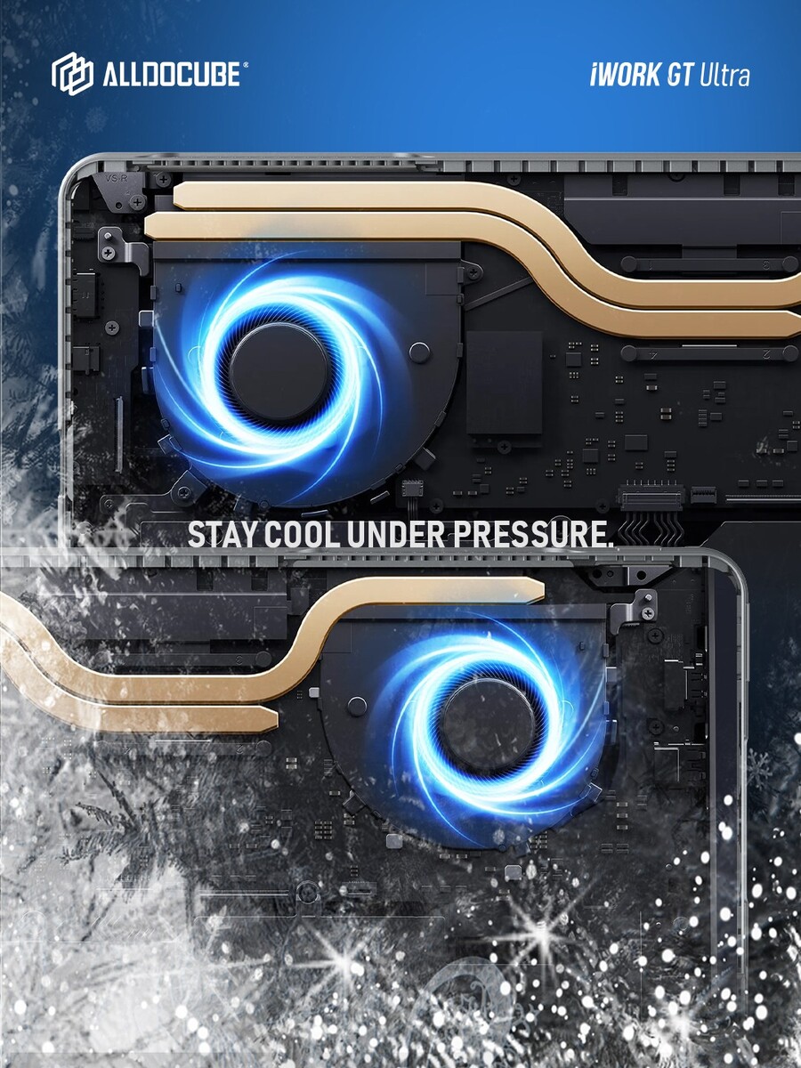 Alldocube a confirmé dans un teaser que l'iWork GT Ultra serait équipé d'un système de refroidissement à double ventilateur. Il s'agirait d'un "design thermique optimal" pour que la tablette Windows soit la plus performante possible tout en restant silencieuse.