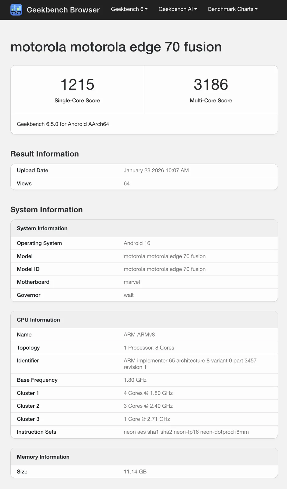 Aujourd'hui, deux listings Geekbench confirment l'idée que Motorola remplacera bientôt le Edge 60 Fusion (actuellement 379 $ sur Amazon) par un successeur direct. Cependant, les deux listes suggèrent que Motorola a équipé le Edge 70 Fusion d'un chipset plus récent que le Snapdragon 7s Gen 3 mentionné dans le récent tweet de Blass. Plus précisément, la vitesse d'horloge de 2,71 GHz sur le cluster 3 du chipset indique qu'il s'agit du Snapdragon 7s Gen 4 Snapdragon 7s Gen 4 plutôt que son prédécesseur.