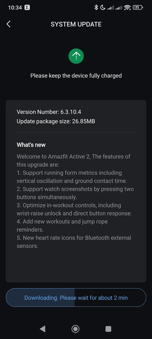 Cependant, cette version n'a pas atteint les utilisateurs de l'Amazfit Active 2 (Round) comme prévu. Il est possible qu'il y ait eu un bug avec cette mise à jour, d'où le report du déploiement et un numéro de version plus élevé. Le journal des modifications de la version 6.3.10.4 du logiciel a été partagé par un utilisateur sur Redditle journal des modifications de la version 6.3.10.4 du logiciel a été partagé par un utilisateur sur Reddit (), énumérant les mêmes fonctionnalités que celles prévues dans la précédente mise à jour OTA 4.1. Il s'agit notamment de mesures de course avancées, comme l'oscillation verticale et le temps de contact avec le sol, ainsi que d'un nouveau mode d'entraînement pour l'ultra-marathon et de rappels de saut à la corde.