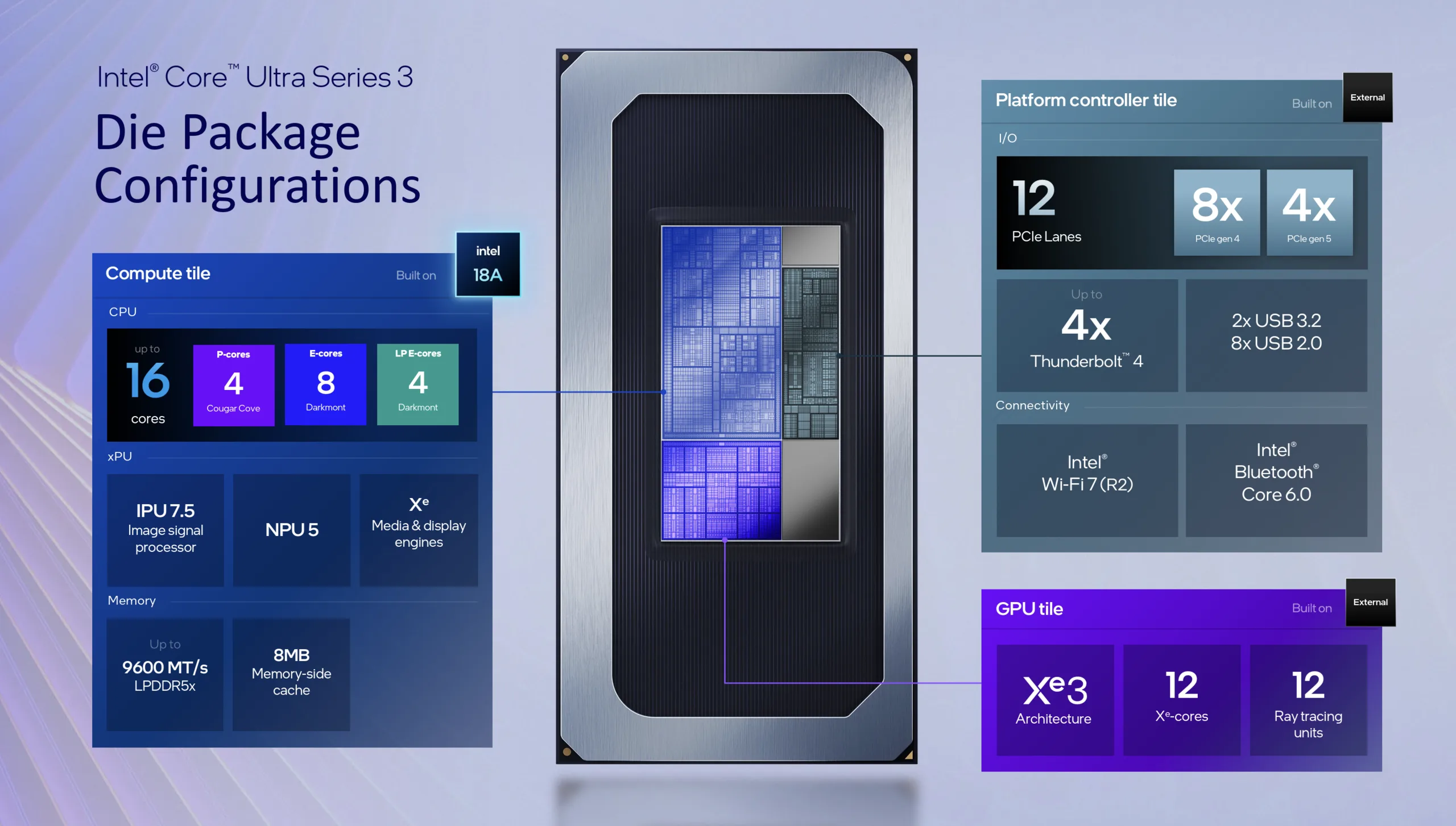 Les nouveaux processeurs mobiles Panther Lake sont à nouveau composés de différentes tuiles, la tuile de calcul étant produite par Intel elle-même (Intel 18A). Selon le modèle, il est possible d'utiliser jusqu'à 16 cœurs au total : quatre cœurs P rapides (Cougar Cove), huit cœurs E (Darkmont) et quatre cœurs E supplémentaires à faible consommation (Darkmont). Des NPU avec 46-50 TOPS sont également installés, ce qui signifie que tous les processeurs Panther Lake répondent aux exigences minimales de la certification Copilot+ de Microsoft. TSMC fabrique les deux autres tuiles (le contrôleur de plateforme et le GPU).