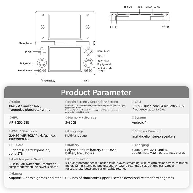 Anbernic complète ce modeste SoC avec 3 Go de RAM, probablement LPDDR4 ou LPDDR4X, 32 Go d'espace de stockage extensible et une batterie de 4 000 mAh pouvant assurer jusqu'à 6 heures de jeu entre deux charges. De plus, l'ordinateur de poche prend en charge la connectivité Bluetooth 4.2 et Wi-Fi 5 avec Android 14 préinstallé.