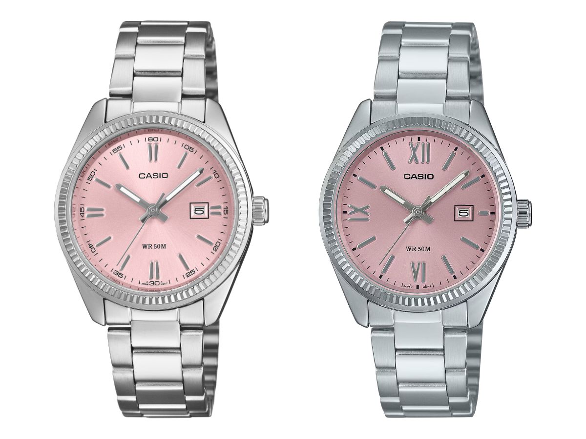 La nouvelle LTP-1302PD-4AV de Casio possède un cadran rose pastel avec des index et des aiguilles de couleur argentée. Ceux-ci sont assortis au boîtier chromé de couleur argent, mesurant 34,5 x 30,2 x 8,7 mm (~1,36 x 1,19 x 0,34 pouces). Ce modèle est également doté d'un bracelet en acier inoxydable et d'une lunette cannelée.