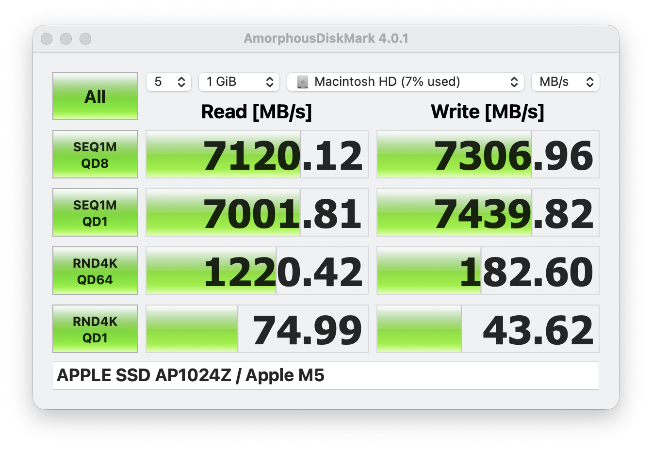 Apple a une nouvelle fois augmenté de manière significative les performances de son nouveau SoC M5, qui est actuellement de loin le processeur monocœur le plus rapide disponible sur le marché. Les améliorations des performances multicœurs et graphiques par rapport à l'ancien SoC M4 sont encore plus importantes. De plus, la vitesse des disques SSD a été augmentée pour atteindre les niveaux PCIe 4.0.