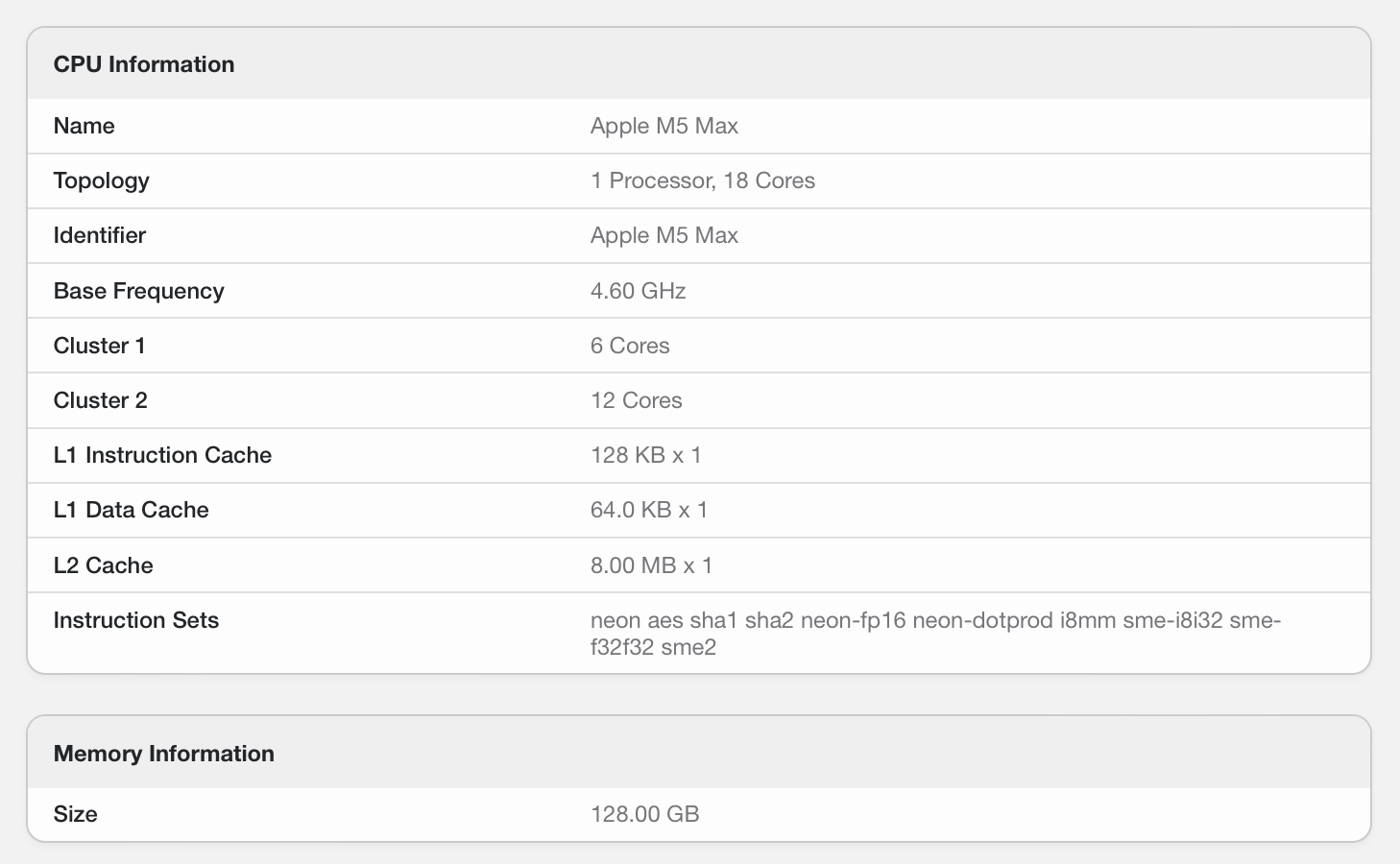 Par rapport à son prédécesseur, le M4 Maxle M5 Max affiche une amélioration d'environ 9 % dans le test à cœur unique. En revanche, dans le test multicœur, la nouvelle puce est environ 14 % plus rapide. Il est intéressant de noter que ce résultat fait également du M5 Max le processeur le plus rapide jamais fabriqué par Apple, avec une avance de 5,4 % sur le M3 Ultra, le modèle le plus haut de gamme.