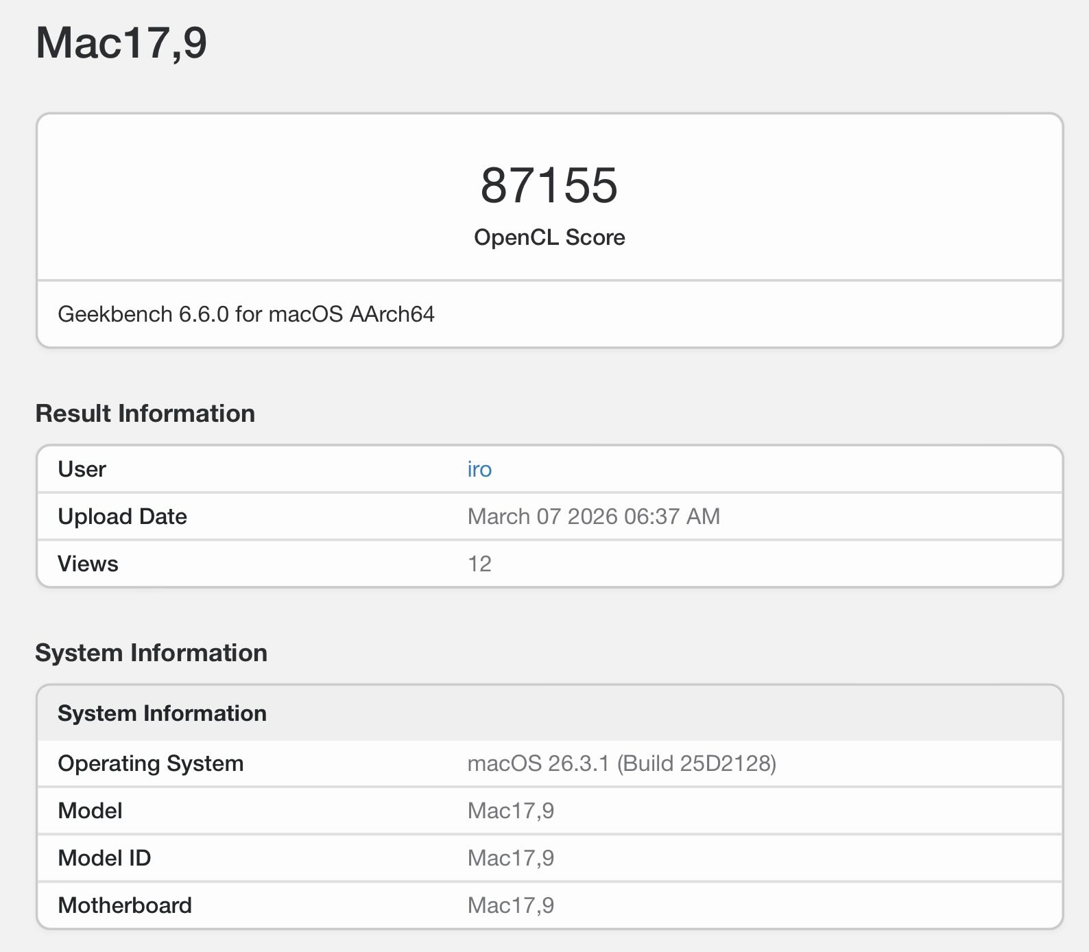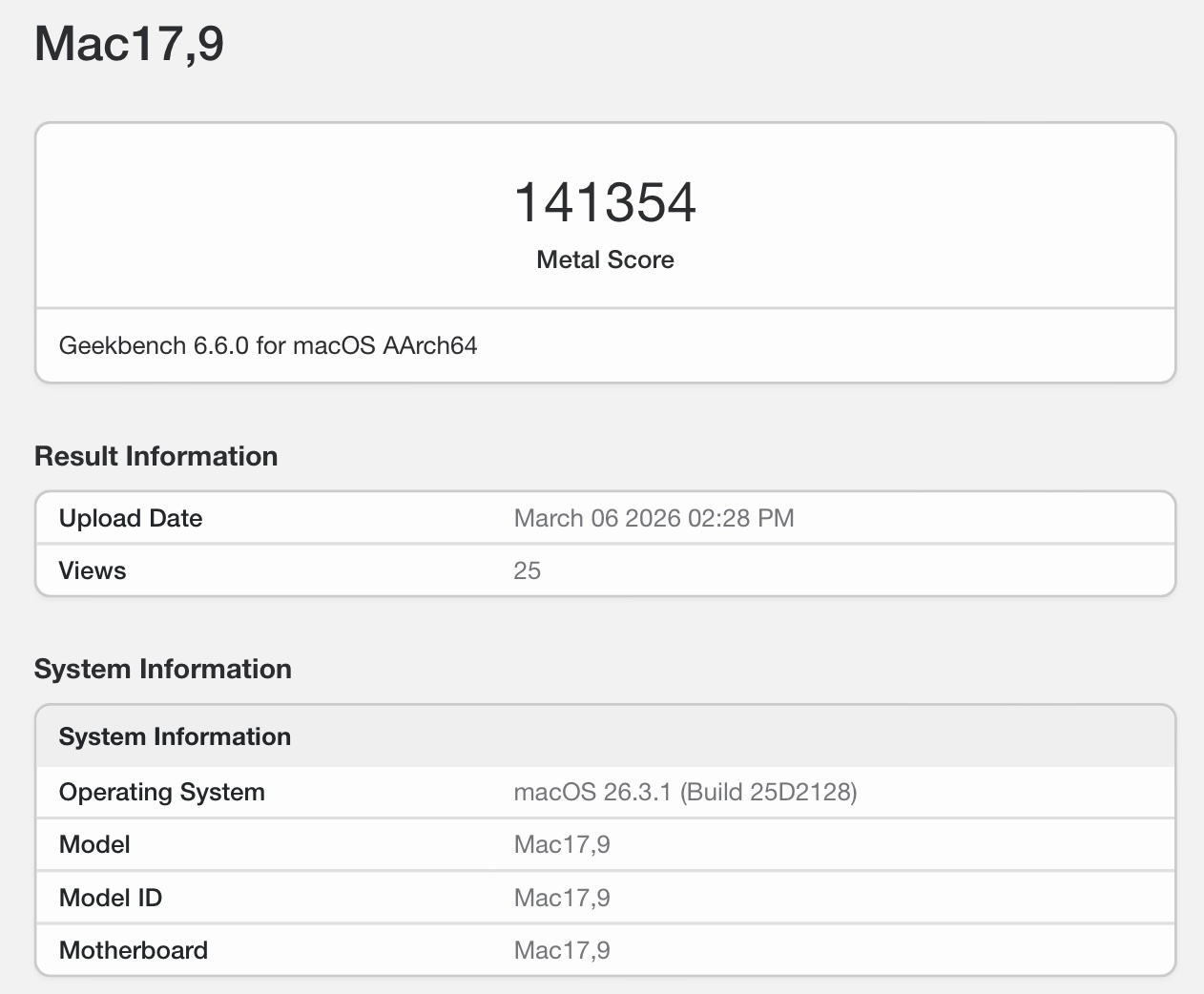 Aujourd'hui, la M5 Pro est apparue sur le site dans le même benchmark également, obtenant un score impressionnant de 141 000 points dans le test Metal. En OpenCL, qui a été déprécié sur macOS il y a plus de 6 ans, le M5 Pro a réussi à obtenir environ 87 155 points. Si l'on considère que le SoC contient deux fois moins de cœurs de GPU que le M5 Max, les résultats sont conformes à ce que l'on peut attendre.