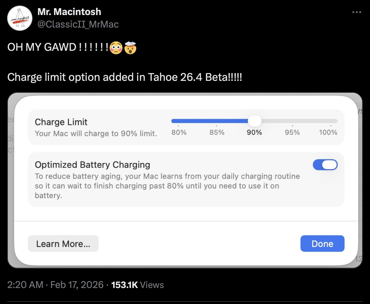 Avec la dernière version macOS Tahoe 26.4 BetaApple semble avoir creusé la tombe d'applications comme AlDente. Pour la première fois, les utilisateurs de MacBook peuvent imposer des limites de charge dans l'application Réglages système, bien que la valeur la plus basse possible soit bloquée à 80 %. Ceux qui souhaitent des valeurs encore plus basses, pour quelque raison que ce soit, devront encore opter pour des solutions tierces.