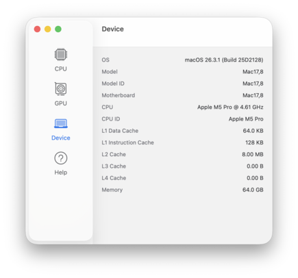 | Moyenne Apple M5 Pro 18-Core, Apple M5 Pro 20-Core GPU (n=1) | |