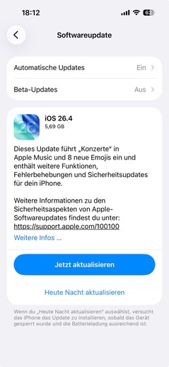 Apple vient de publier iOS 26.4. La mise à jour du système d'exploitation est disponible pour tous les modèles, de l'iPhone 11 à l'iPhone 17(799 $ sur Amazon), ainsi que pour l'iPhone SE de deuxième génération. La mise à jour peut être téléchargée et installée comme d'habitude via les paramètres du système sous Général --> Mise à jour du logiciel.