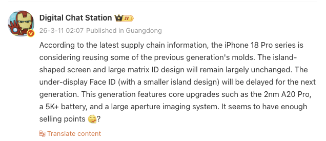 Le leaker ajoute que l'iPhone 18 Pro bénéficiera de quelques améliorations, comme la puce A20 Pro basée sur une architecture 2nm, un système d'appareil photo à plus grande ouverture et une batterie de plus de 5 000 mAh une batterie de plus de 5 000 mAh - probablement uniquement pour l'iPhone 18 Pro Max.