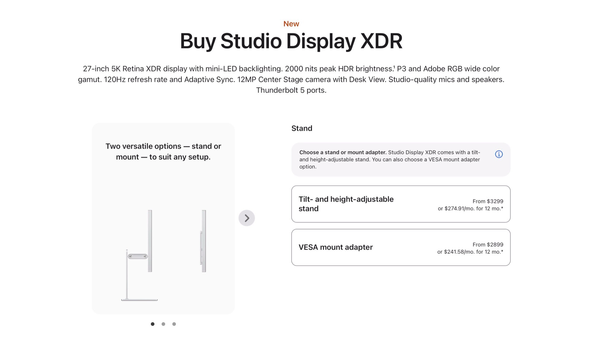 Les choses changent à présent, car si la version avec pied est toujours disponible au prix de 3 299 dollars, Apple réduit le prix de la version avec adaptateur VESA à 2 899 dollars - soit une réduction de 400 dollars. Pour le verre nanotexturé à faible réflexion, Apple facture encore 300 dollars supplémentaires