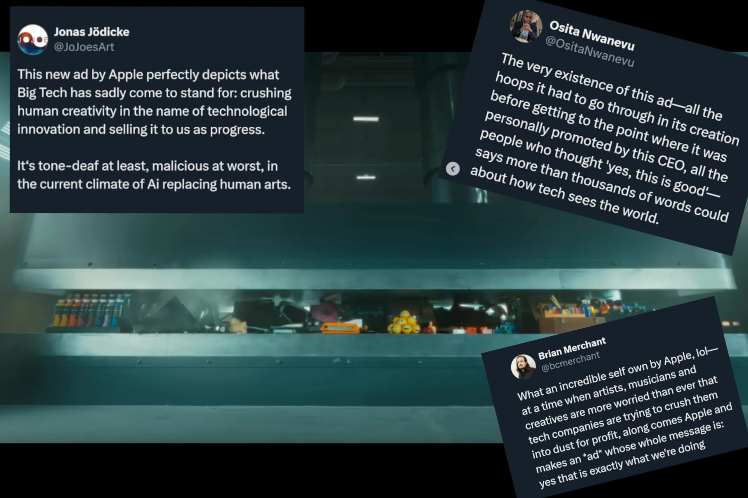 Dans le cadre du lancement des nouveaux iPads M4Apple a publié une vidéo promotionnelle (que vous pouvez visionner ci-dessous), intitulée Crush, qui montre une collection de fournitures artistiques traditionnelles et d'outils créatifs écrasés par une broyeuse de taille industrielle. Lorsque la presse est à nouveau levée, tout ce qui reste des innombrables supports et outils artistiques et musicaux traditionnels est le nouvel iPad Pro de Apple, d'une finesse impressionnante, l'implication étant apparemment que l'iPad peut servir aux créatifs comme outil pour tout, de la création musicale à l'art numérique, et même au montage vidéo.