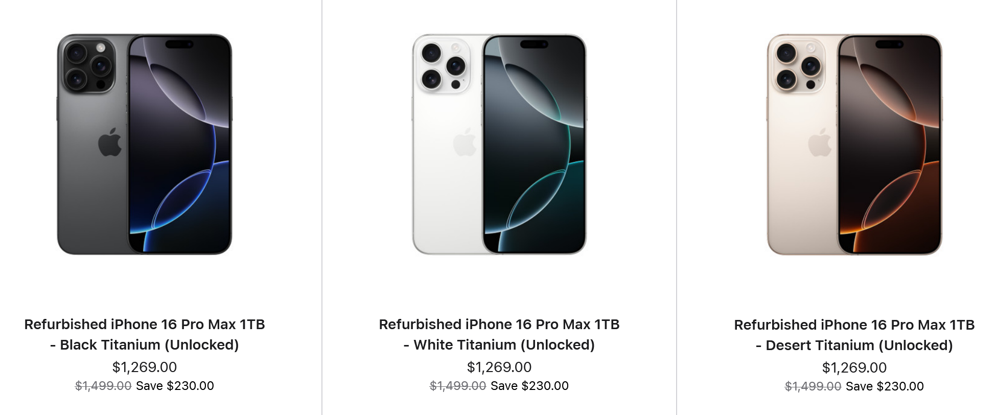 Certains de ces modèles peuvent être trouvés moins chers en tant qu'appareils remis à neuf ailleurs. Par exemple, un iPhone 16 en "excellent" état avec 128 Go d'espace de stockage peut être acheté sur Black Market pour 574soit 45 $ de moins que l'équivalent remis à neuf sur Apple