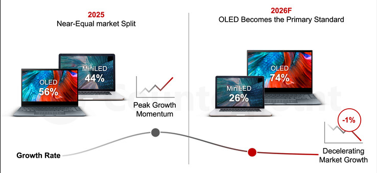 Alors que l'activité du marché dans son ensemble semble ralentir, le segment des écrans haut de gamme connaîtra bientôt un changement majeur, selon le rapport. Les livraisons d'ordinateurs portables OLED devraient augmenter de 33 % l'année prochaine - contrairement à la technologie Mini LED, qui devrait connaître une baisse de 43 % des livraisons, car les marques abandonnent le système de rétroéclairage vieillissant au profit de panneaux auto-émissifs.