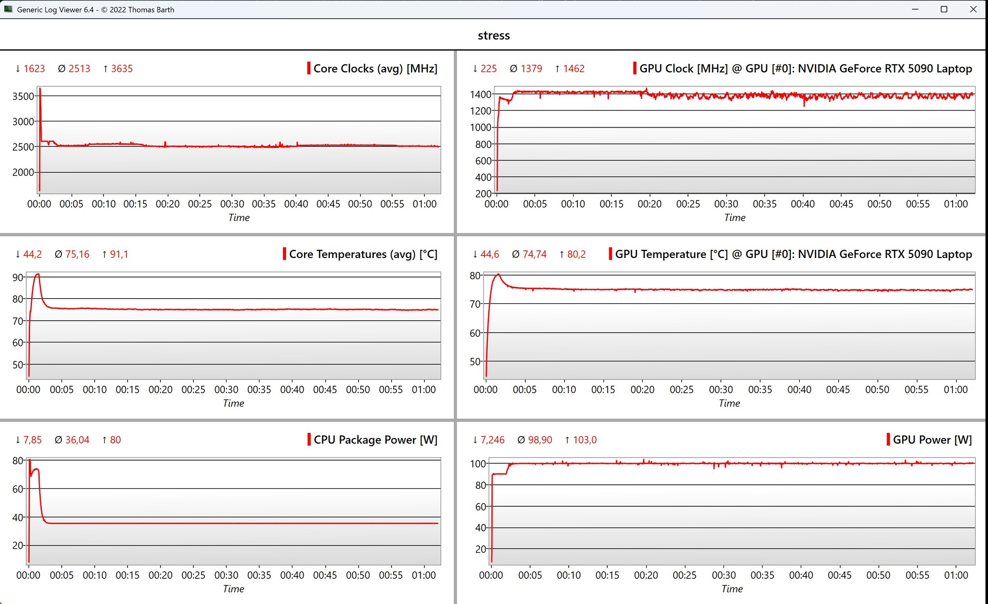 | Asus ProArt P16 RTX 5090 Ryzen AI 9 HX 370, GeForce RTX 5090 Laptop, Micron 2500 2TB MTFDKBA2T0QGN-1BN1AABGA, OLED, 3840x2400, 16" | Asus ROG Zephyrus G16 GU605CX Ultra 9 285H, GeForce RTX 5090 Laptop, Western Digital PC SN5000S SDEPNSJ-2T00-1006, OLED, 2560x1600, 16" | Razer Blade 16 2025 RTX 5090 Ryzen AI 9 HX 370, GeForce RTX 5090 Laptop, SSSTC CA6-8D2048, OLED, 2560x1600, 16" | Apple MacBook Pro 16 M4 Max M4 Max (16 cores), M4 Max 40-Core GPU, Apple SSD AP1024Z, Mini-LED, 3456x2234, 16.2" | Lenovo Yoga Pro 9i 16 RTX 5070 Ultra 9 285H, GeForce RTX 5070 Laptop, WD PC SN7100S SDFPMSL-1T00-1101, OLED, 3200x2000, 16" | Asus ProArt P16 H7606WP Ryzen AI 9 HX 370, GeForce RTX 5070 Laptop, WD PC SN740 SDDPNQE-2T00, OLED, 2880x1800, 16" | Apple MacBook Pro 16 2024 M4 Pro M4 Pro (14 cores), M4 Pro 20-Core GPU, Apple SSD AP2048Z, Mini-LED, 3456x2234, 16.2" | Moyenne Nvidia GeForce RTX 5090 Laptop | Moyenne de la classe Multimedia | |