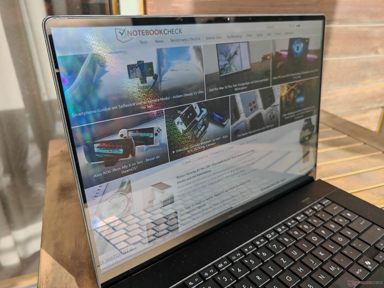 Le ROG Zephyrus G16 et le précédent ProArt P16, avec son écran OLED de 2,8K, sont tous deux des modèles de qualité supérieure ProArt P16, avec son OLED 2,8K, n'étaient pas particulièrement convaincants en termes de luminosité. Les deux images comparatives ci-dessus mettent immédiatement en évidence la différence apportée par la luminosité accrue de la nouvelle dalle Lumina Pro. Au lieu d'environ 360 cd/m², elle atteint désormais 660 cd/m² en mode SDR. Le MacBook Pro (avec le capteur de luminosité activé) et le Yoga Pro 9i 16 atteignent même 1 000 cd/m².