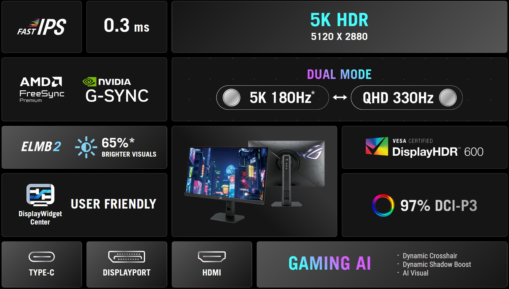 Un nouveau moniteur de jeu a été repéré sur le site officiel d'Asusle ROG Strix XG27JCG. Il s'agit d'un modèle à double mode qui peut basculer entre les modes 5K 180Hz et QHD 180Hz. Bien sûr, le premier taux de rafraîchissement à la résolution de 5120x2880 pixels ne s'applique qu'en mode overclocké, mais c'est tout de même un chiffre impressionnant.