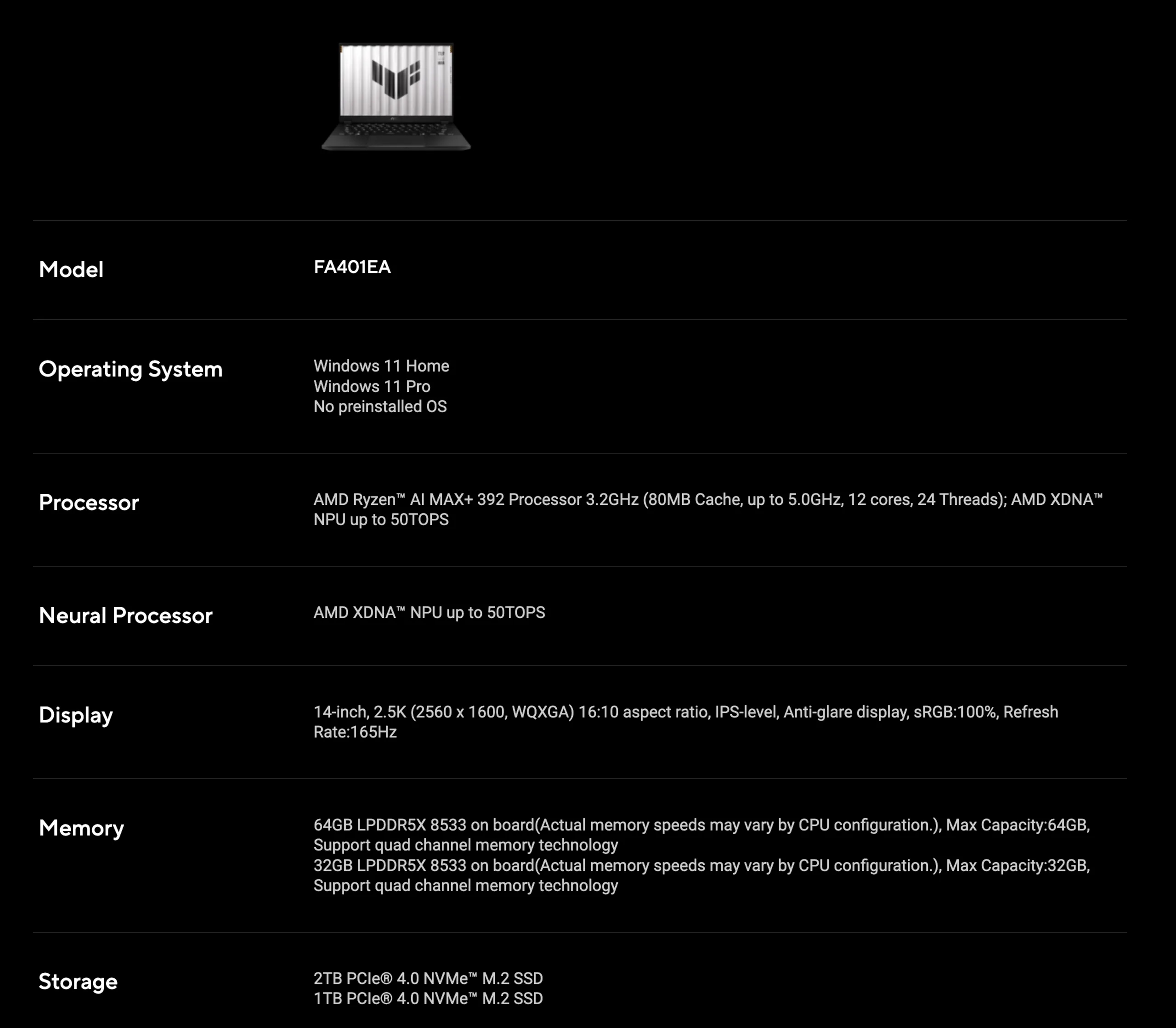 La semaine dernière, Asus a lancé son premier ordinateur portable de jeu AMD Strix Halo sur plusieurs marchés. Vendu sous le nom de TUF Gaming A14 (FA401EA), l'ordinateur portable est actuellement le seul appareil équipé du processeur AMD Ryzen AI Max+ 392 APU D'AMD. Bien qu'il s'agisse d'une option de niveau inférieur par rapport à l'APU Ryzen AI Max+ 395 à l'intérieur du ROG Flow Z13 (actuellement 2 169 $ sur Amazon), ce nouvel APU devrait offrir des performances graphiques similaires grâce à une Radeon 8060S identique.