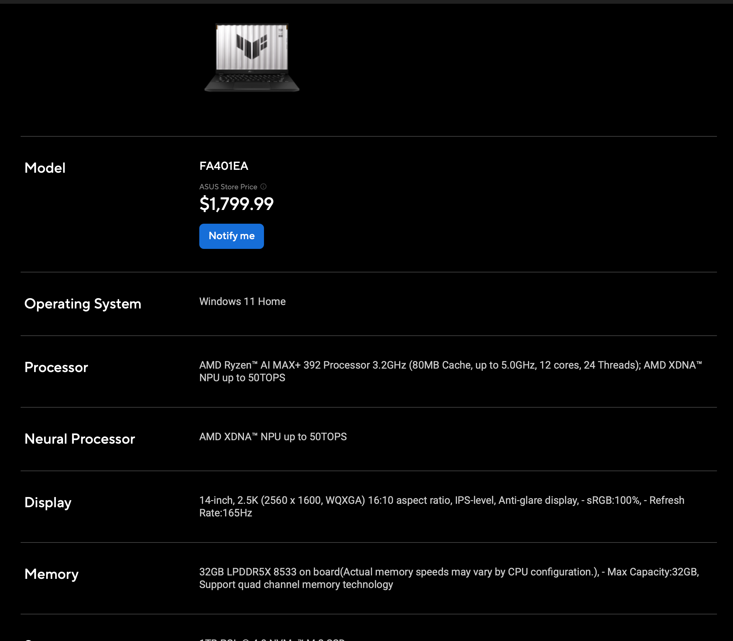 Asus a également confirmé les prix pour les Etats-Unis. Il semble peu probable qu'Asus propose la variante optionnelle de 64 Go de RAM aux clients américains. Au lieu de cela, Asus ne propose que la variante avec 32 Go de RAM sur sa boutique en ligne américaine, au prix de 1 799 $ avec 1 To de stockage. De plus, les spécifications techniques du FA401EA sur son site web américain ne mentionnent pas le modèle de 64 Go qu'elle vend déjà en Chine, au Japon et en Europe.