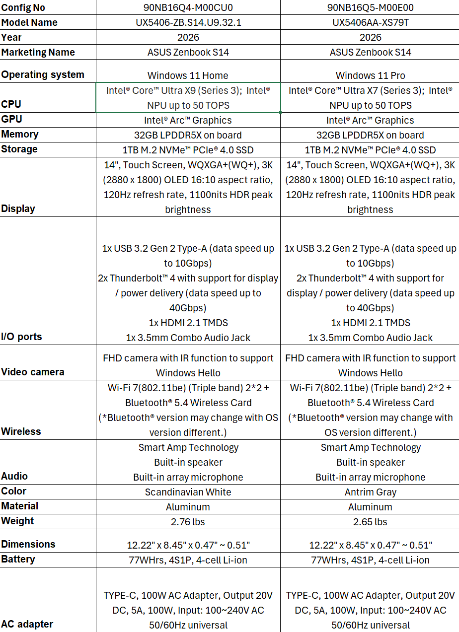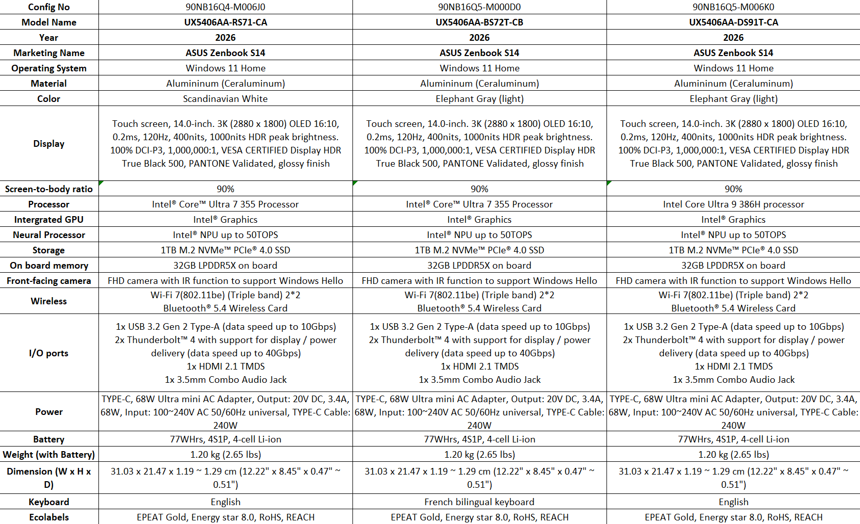 Selon les documents de presse d'Asus, la version américaine du Zenbook S14 propose les processeurs suivants Core Ultra X7 et Core Ultra X9 tandis que la version canadienne est limitée au Core Ultra 9 386H Core Ultra 9 386H et au Core Ultra 7 355. Les unités vendues en Europe devraient également recevoir les processeurs Core Ultra X Series 3, qui intègrent les fonctions suivantes Arc B390 intégrés.