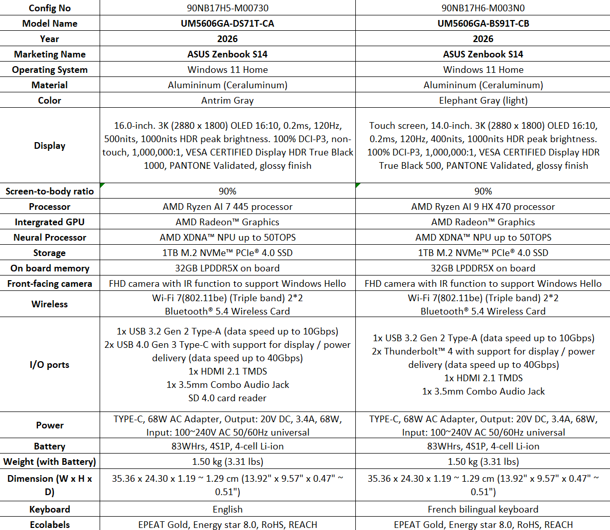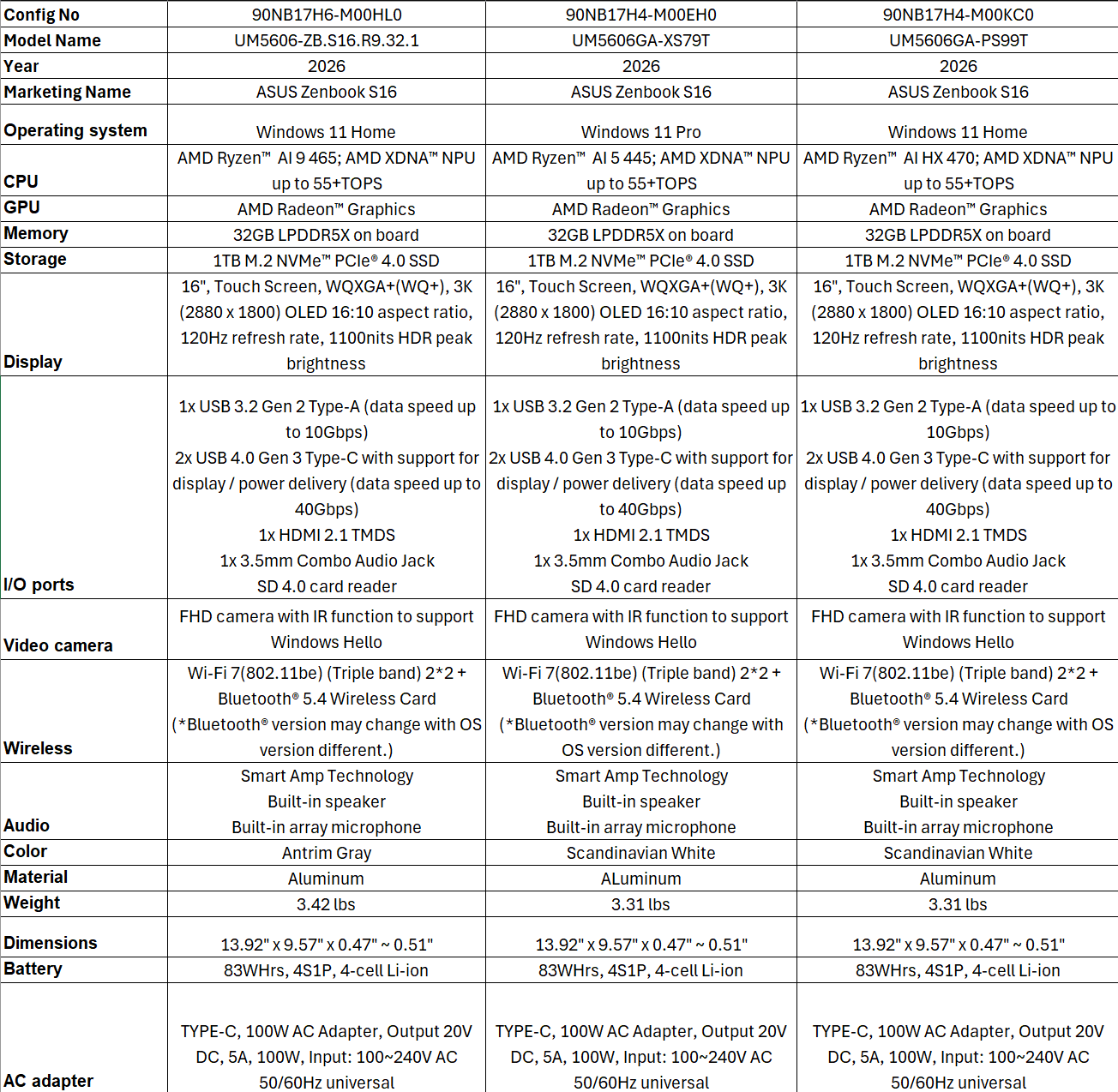 Le Zenbook S16 (UM5606), quant à lui, est équipé du nouveau processeur AMD Ryzen AI 400 Gorgon Point AMD Ryzen AI 400 Gorgon Point D'AMD. Les configurations proposées pour le marché américain comprennent celles basées sur les APU Ryzen AI 9 HX 470 d'AMD Ryzen AI 9 HX 470, Ryzen AI 9 465et un étrange Ryzen AI 5 445 (probablement une faute de frappe) qui ne figure pas encore dans la liste d'AMD.