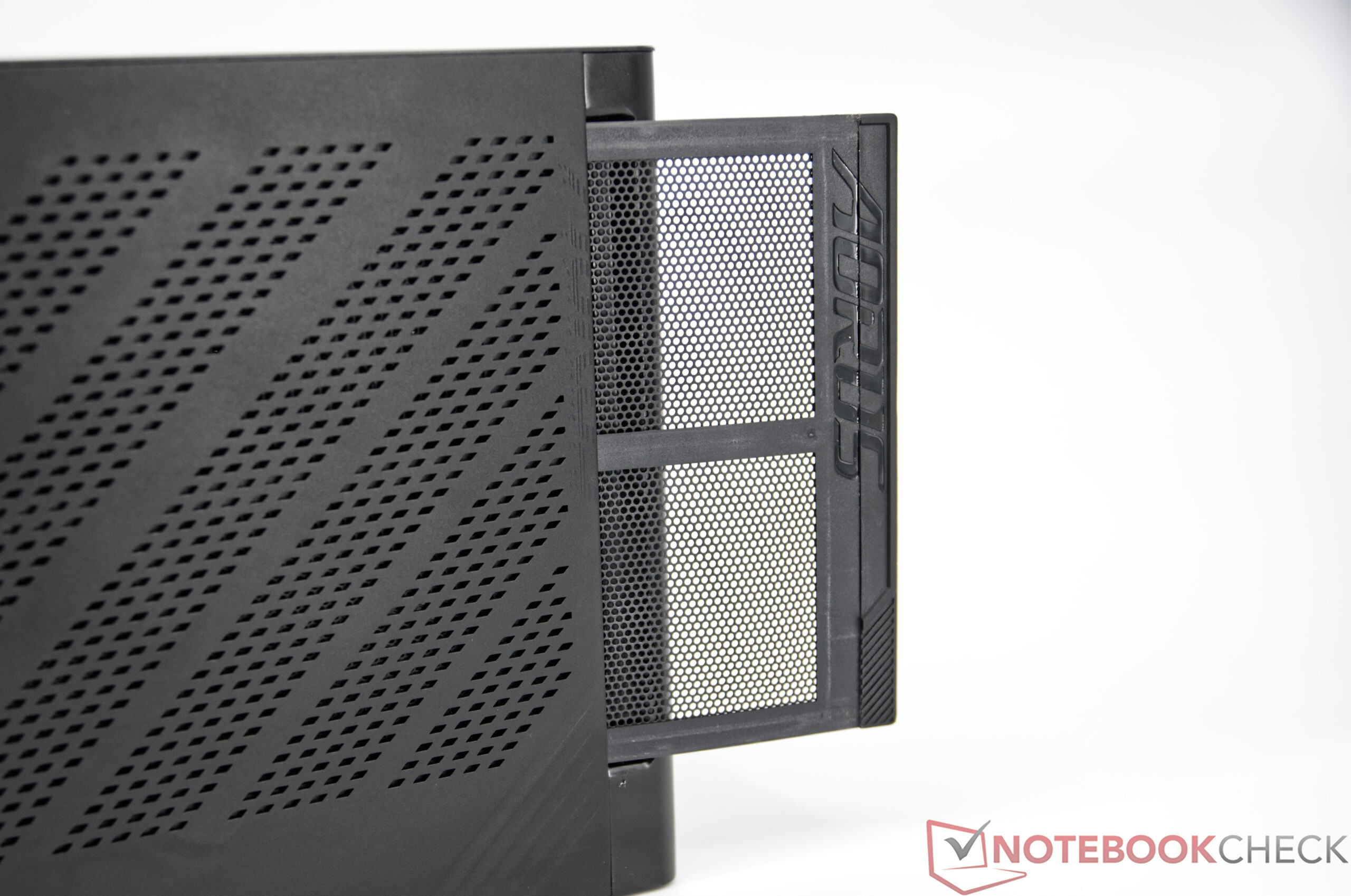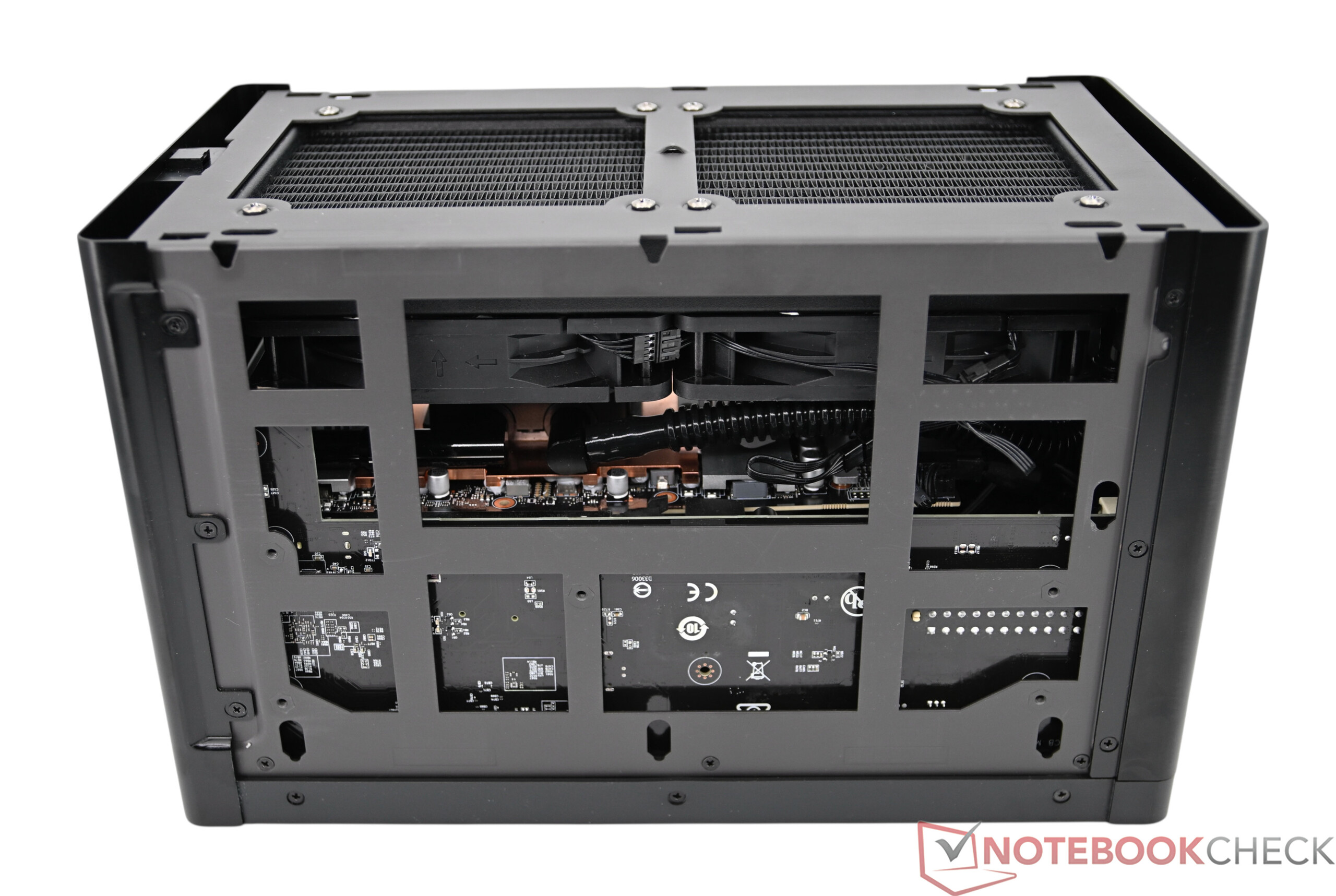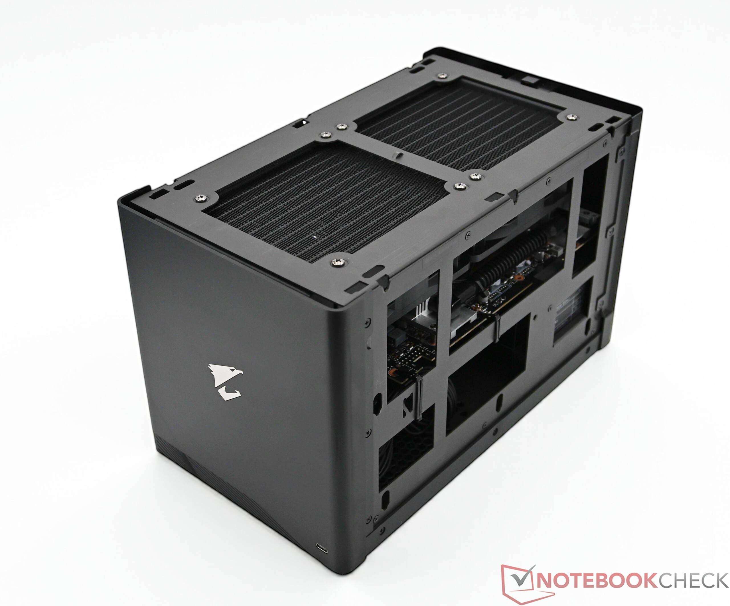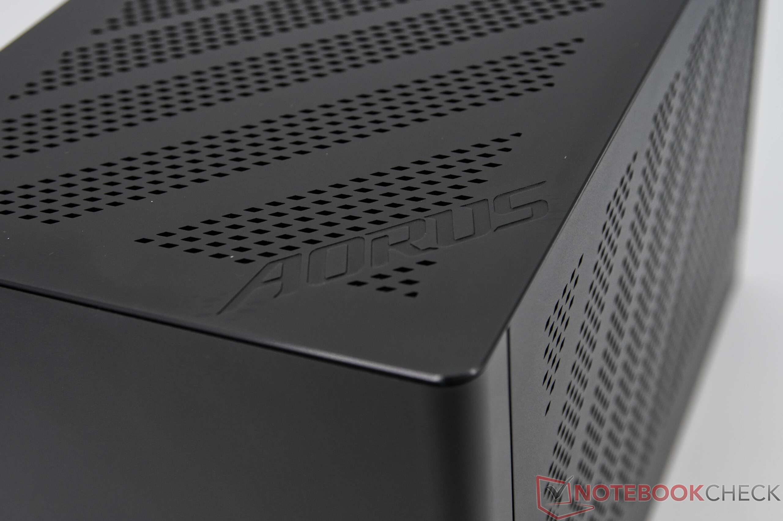 Gigabyte intègre la GeForce RTX 5090 dans l'Aorus RTX 5090 AI Box avec un puissant système de refroidissement AiO et un bloc d'alimentation de 850 watts dans un boîtier particulièrement compact et stable. Celui-ci est principalement composé de métal, ce qui garantit un haut niveau de robustesse et une apparence de haute qualité. Le couvercle et les panneaux latéraux peuvent être retirés sans outils, et ces derniers sont également équipés de filtres à poussière qui peuvent être facilement tirés vers l'arrière, même lorsqu'ils sont fermés. Le boîtier et les composants installés peuvent être démontés si nécessaire. En ce qui concerne la finition, il n'y a guère de critiques à formuler. Visuellement, le boîtier est discrètement mis en valeur par un logo AORUS éclairé sur la face avant, dont les effets peuvent être ajustés via le Gigabyte Control Center ou complètement désactivés si nécessaire. Le seul inconvénient est que les surfaces métalliques laissent rapidement apparaître les traces de doigts.