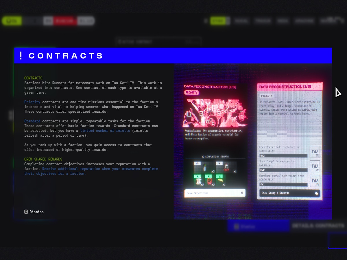 L'idée structurelle la plus forte de Marathon jusqu'à présent est son système de contrats basé sur les factions. Les factions engagent des Runners pour travailler sur Tau Ceti IV, et ce travail est divisé en contrats prioritaires et standards. Les contrats prioritaires sont des travaux ponctuels liés aux intérêts de la faction et au mystère de ce qui s'est passé sur Tau Ceti IV, tandis que les contrats standards sont des tâches répétitives avec des récompenses plus routinières.