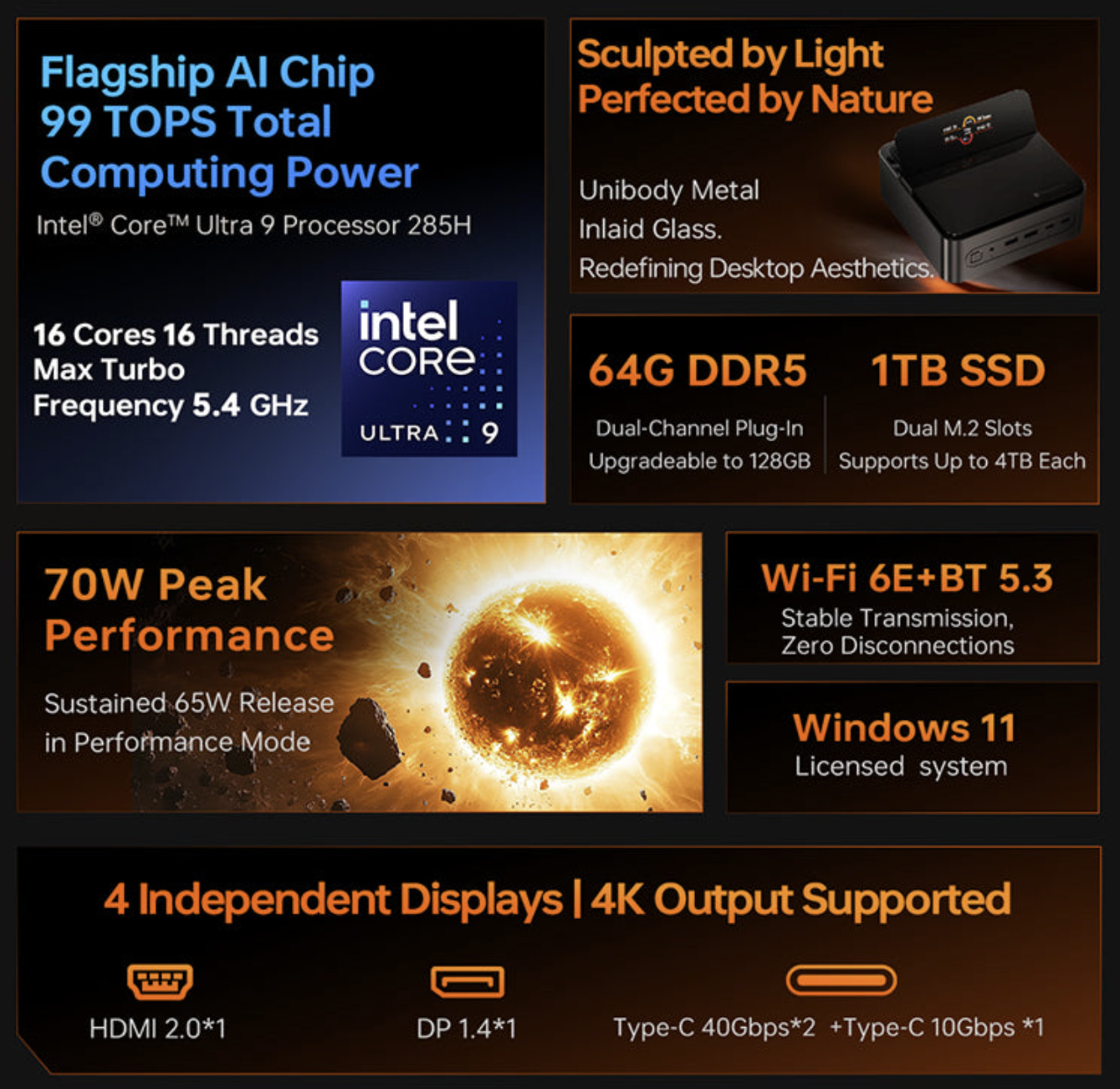 En conséquence, le mini-PC est arrivé dans le monde entier à un prix plutôt élevé, à savoir 1 799 $. Pour ce prix, le Machenike GTS est équipé d'un Core Ultra 9 285H 64 Go de RAM DDR5 et 1 To de stockage PCIe 4.0. Veuillez noter qu'un second slot M.2 2280 est disponible pour ajouter plus de stockage en cas de besoin. De plus, les deux emplacements SO-DIMM du mini-PC supportent jusqu'à 128 Go de RAM DDR5-5600. Veuillez consulter le Site web de Minixpc pour plus de détails.