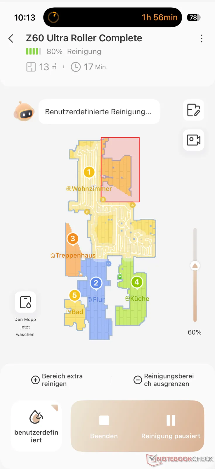 Le Mova Z60 Ultra Roller Complete a terminé notre routine de nettoyage habituelle de 50 mètres carrés avec des sols principalement lisses et un peu de moquette, ce que chaque robot aspirateur de test doit faire avec les réglages standard, avec 34 % de capacité restante dans la batterie de 6 400 mAh. Cela signifie que le modèle à franges est très gourmand en énergie et qu'il ne peut nettoyer qu'une bonne soixantaine de mètres carrés par charge de batterie avec ces réglages.