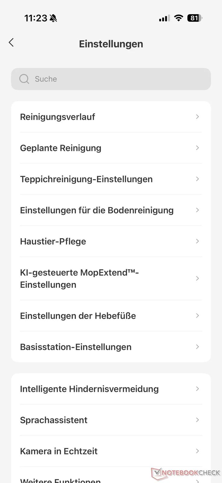 Diverses options sont disponibles dans le menu pour définir le comportement de l'aspirateur robot et de la station. Outre son propre assistant vocal, qui parle également allemand, des nettoyages programmés et une fonction de vidéo en direct complètent les fonctionnalités de l'application Mova, qui a fait ses preuves. Seule la prise en charge de la matière nous manque.